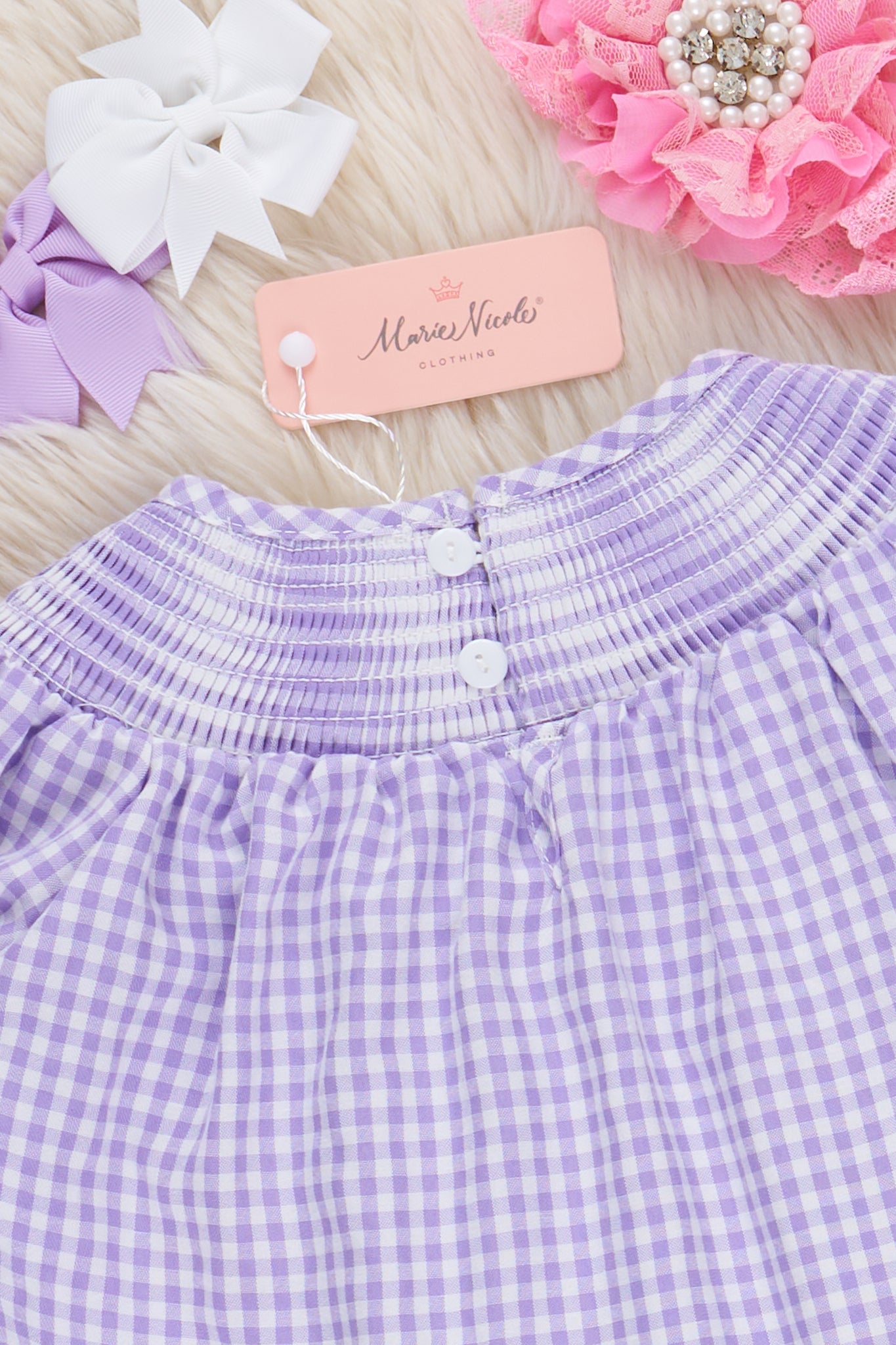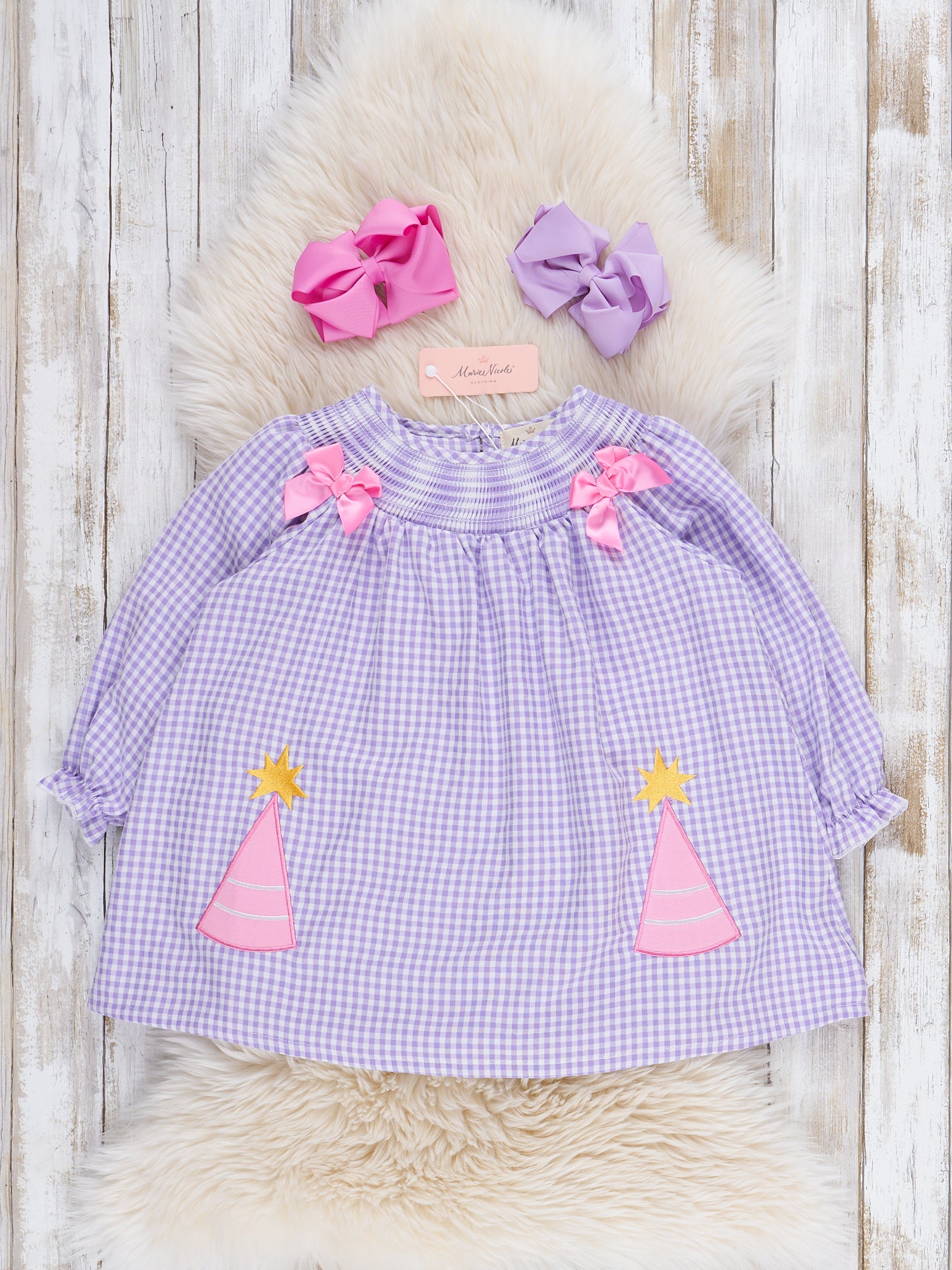 The Party Hat Smocked Gingham Dress by Marie Nicole features a classic plaid pattern with playful embroidered party hats on the pockets and decorative bows at the shoulders. With gathered sleeves and a relaxed silhouette, this dress brings celebratory charm and comfortable style to special occasions.