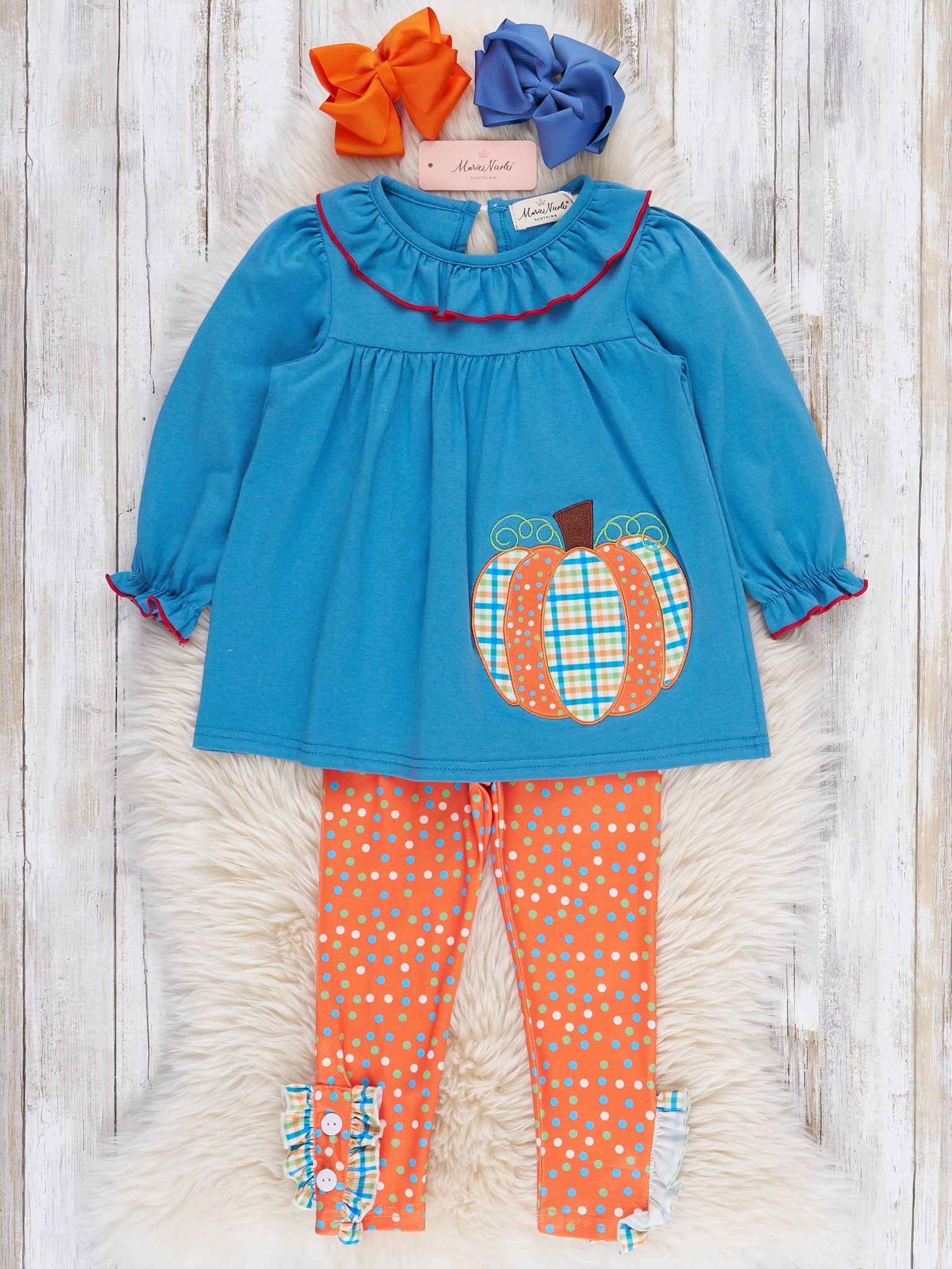 Fall is here, and little ones are raring to go in their Blue and Orange Dot Pumpkin Ruffle Outfit! Get ready for the season with this stylish outfit featuring an adorable swing top with embroidered pumpkin detail and polka dot leggings.