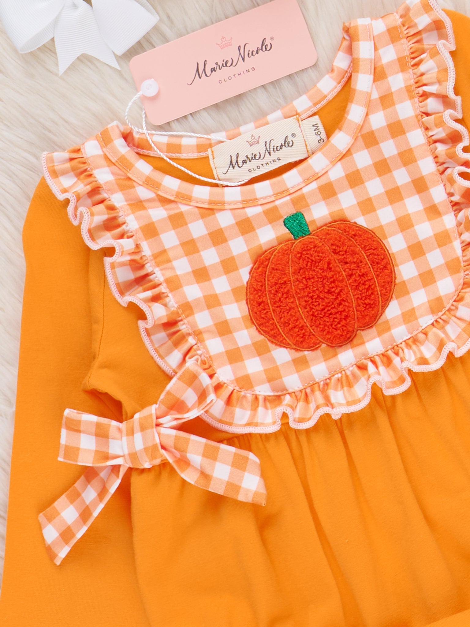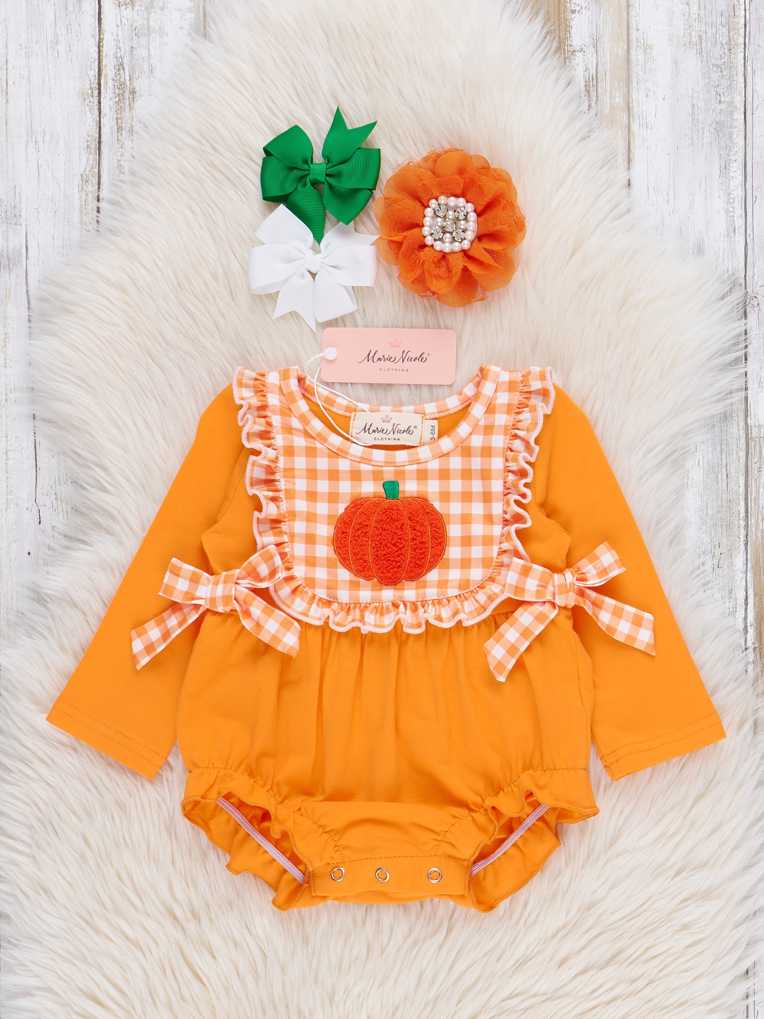 The Embroidered Gingham Patch Pickin’s Bubble is a sweet and cozy choice for autumn days and festive adventures. Featuring charming embroidered pumpkin on a classic gingham fabric, this bubble from Marie Nicole Clothing blends rustic fall charm with soft, breathable comfort. Perfect for pumpkin patches, family outings, and picture-perfect seasonal moments.