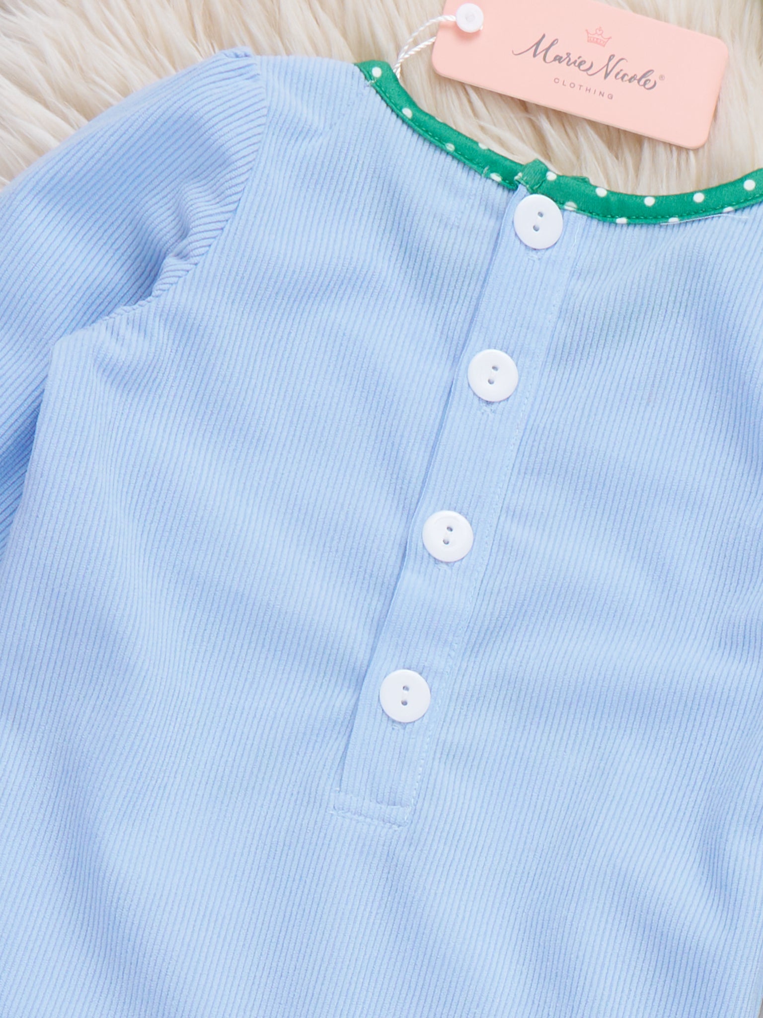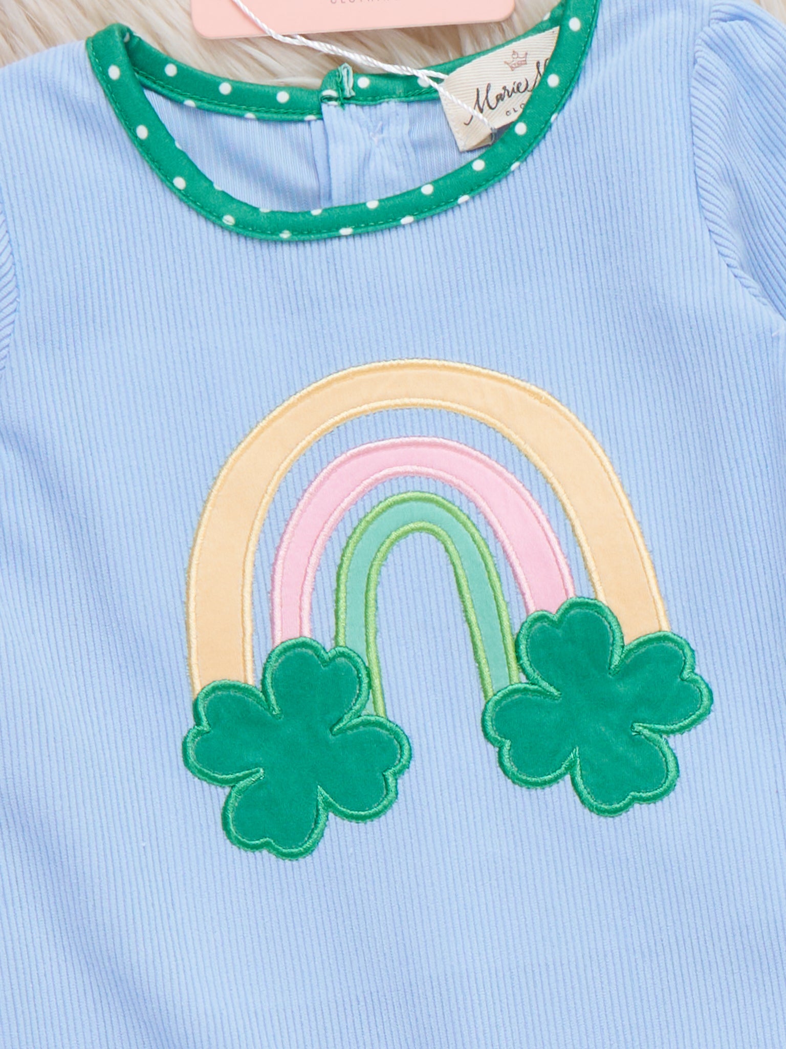 Get lucky in style with our Luckiest Rainbow Embroidered Ruffle Romper by Marie Nicole Clothing! Perfect for St. Patrick's Day celebrations, this girls' romper features a charming embroidered rainbow with pots of gold. The blue bodice and polka dot ruffle trim add an extra touch of whimsy. Pick out this one-piece and spread the luck!