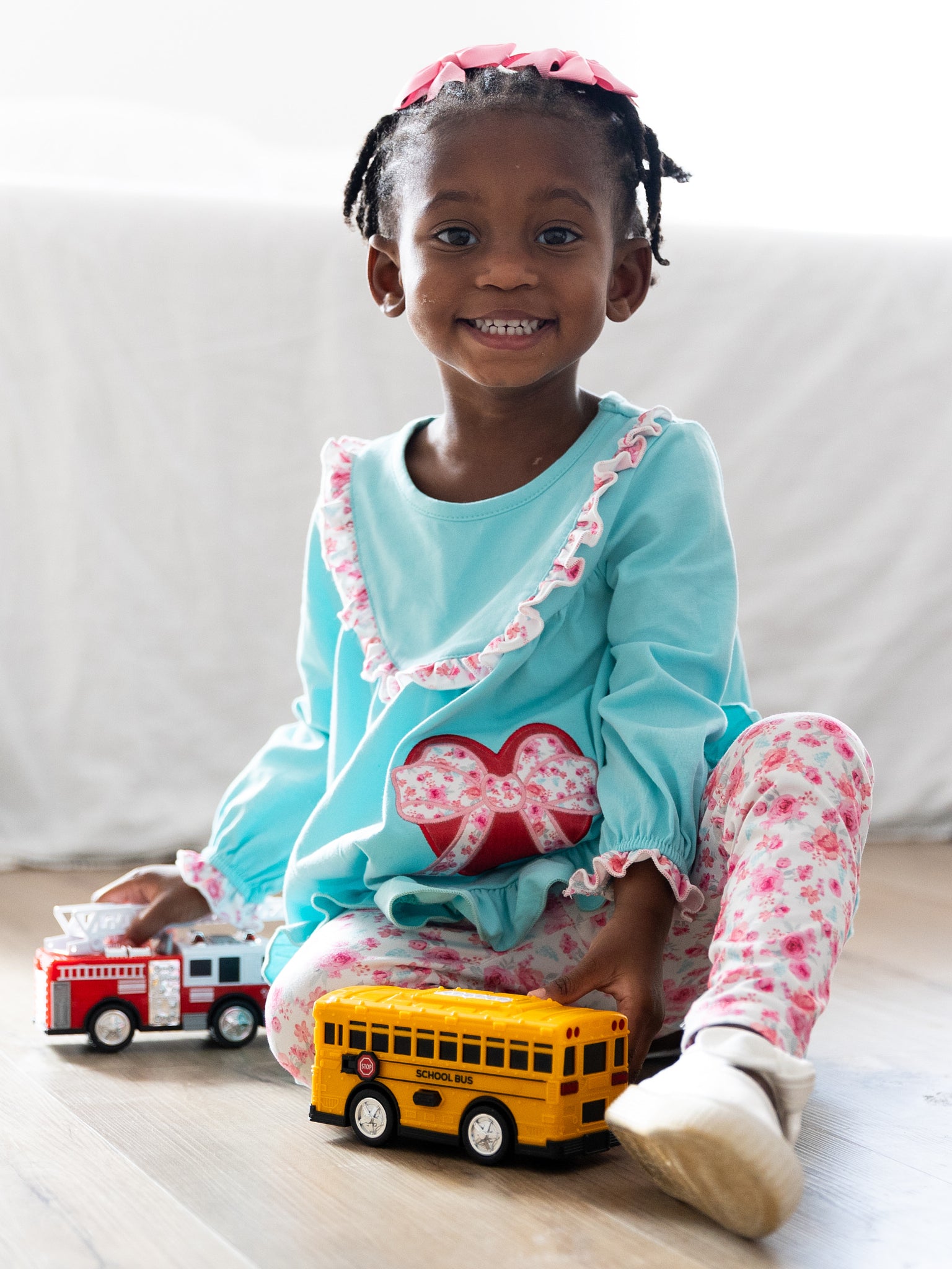 Love & Petals Embroidered Ruffle Outfit by Marie Nicole Clothing includes a flowy long-sleeve top with ruffle trim, a heart-and-bow appliqué, and playful floral leggings. This set brings together charming embroidery, a touch of frill, and a lively floral print for a sweet, coordinated look perfect for special Valentine's occasions or everyday twirls.