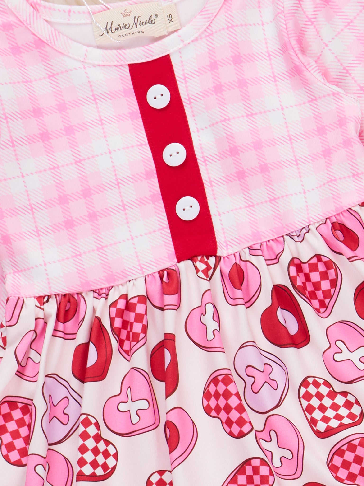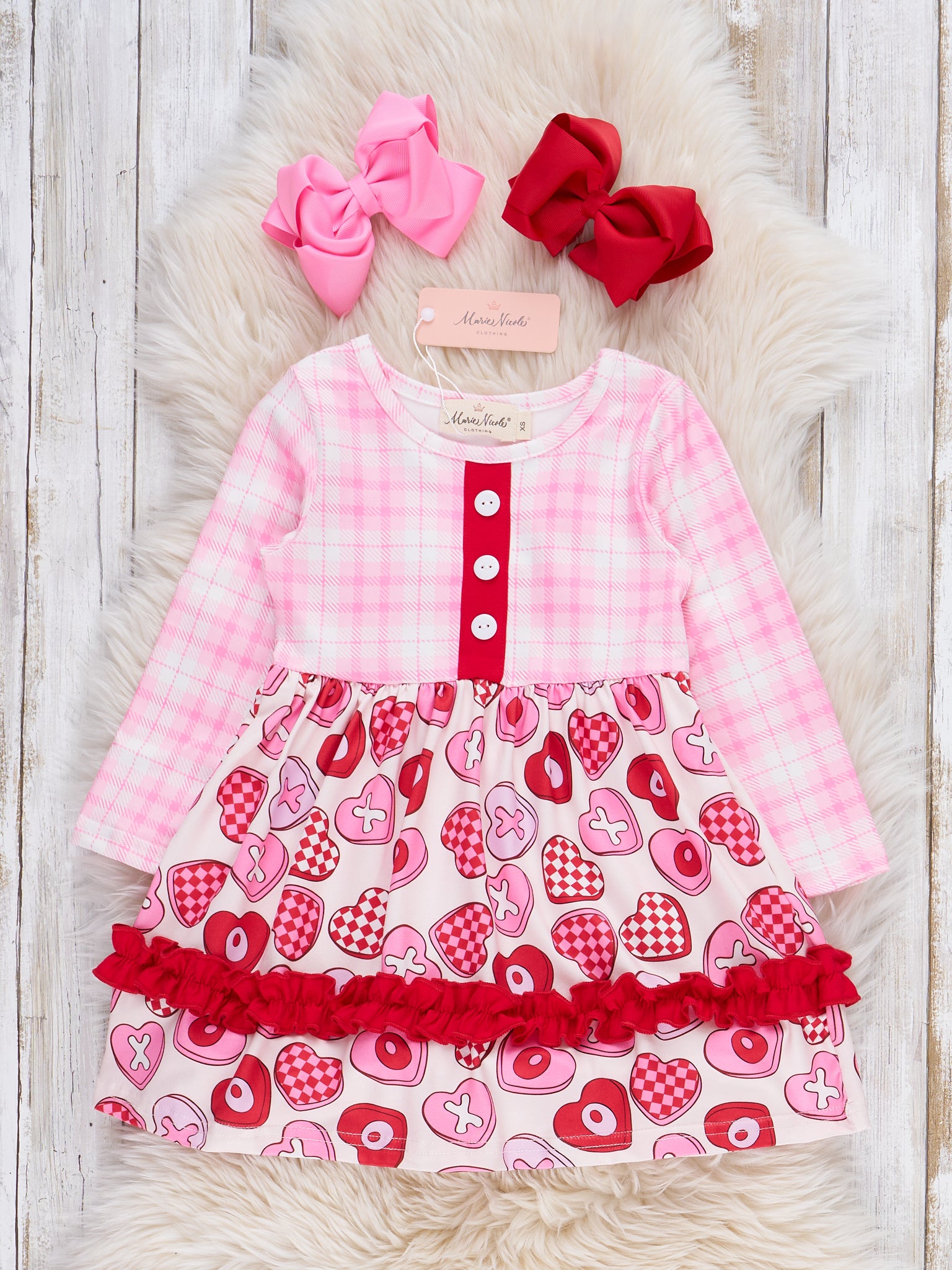 Lovebug Ruffle Plaid Dress by Marie Nicole Clothing combines classic plaid with a playful skirt adorned in heart-shaped sweets, finished with charming ruffle and button details. Perfect for picture-worthy celebrations or joyful seasonal gatherings, this dress brings a cheerful Valentine's Day spirit and a touch of sweetness to any special day.