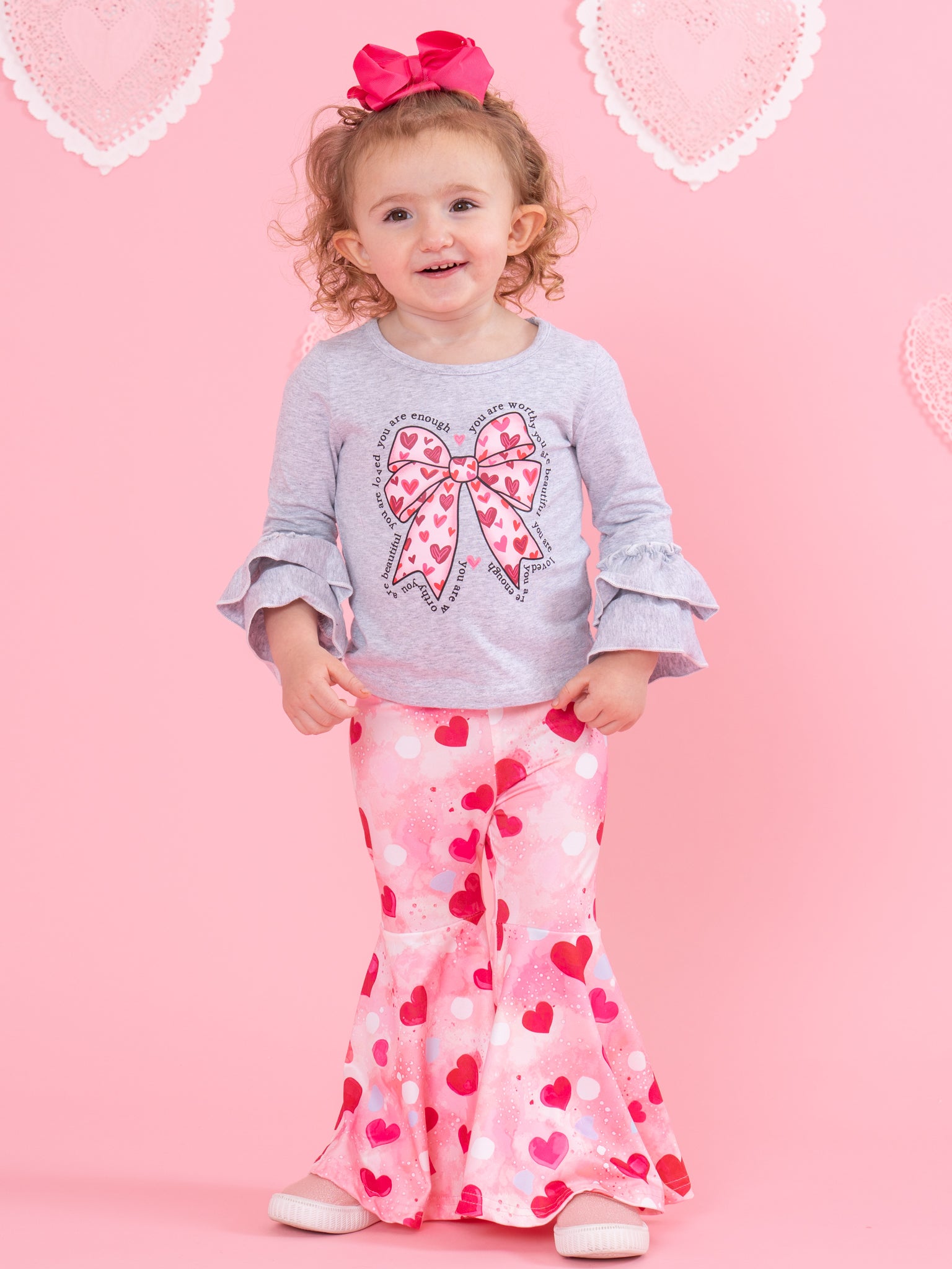 Sparkle Heart Bow Bell Bottom Outfit by Marie Nicole Clothing features a charming long-sleeve top with a heart-bow motif and playful ruffle cuffs, paired with bell bottom pants adorned in a cheerful heart pattern. This outfit brings together whimsical details and comfort, making it ideal for special celebrations like Valentine's Day, everyday confidence, or a standout seasonal look.