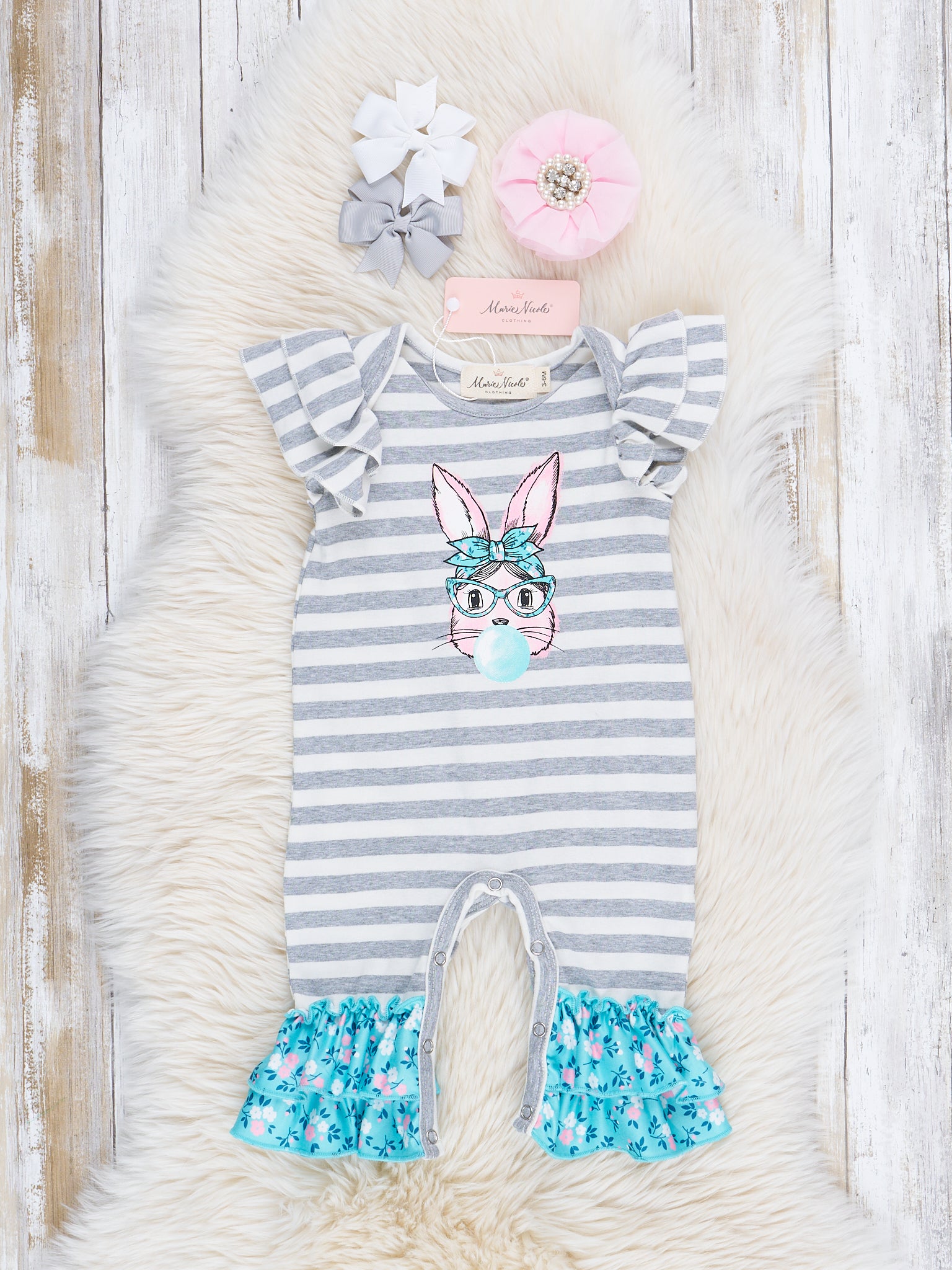 Grey Striped Bubblegum Bunny Ruffle Romper