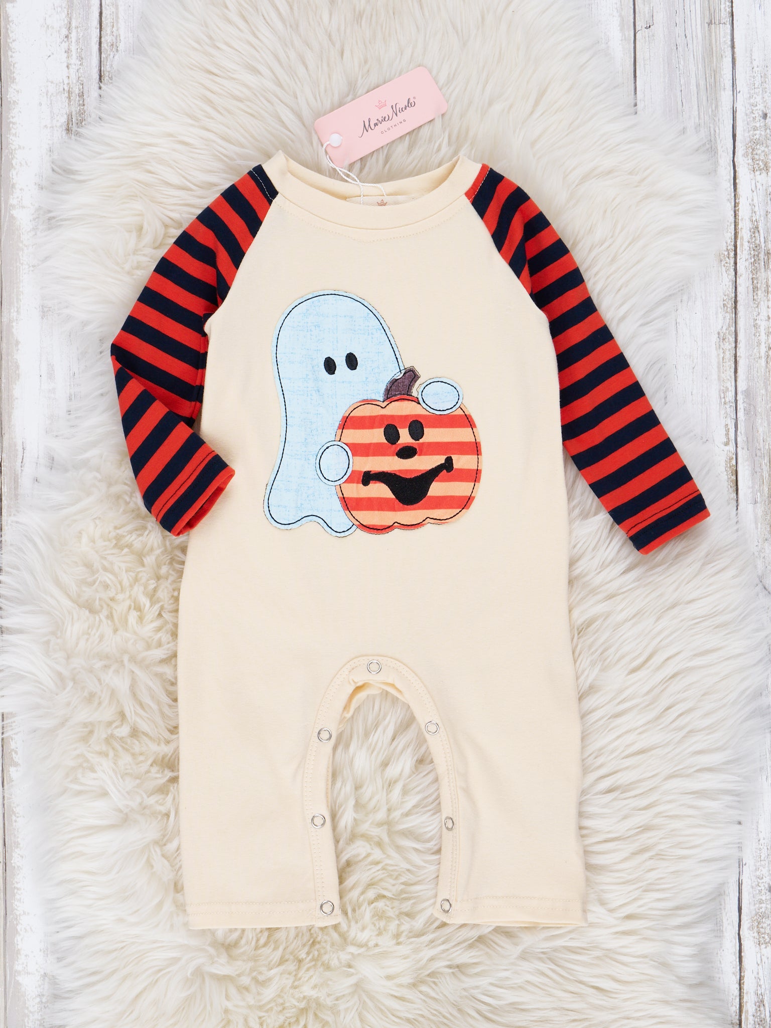 Beige Embroidered Ghost & Pumpkin Raglan Romper