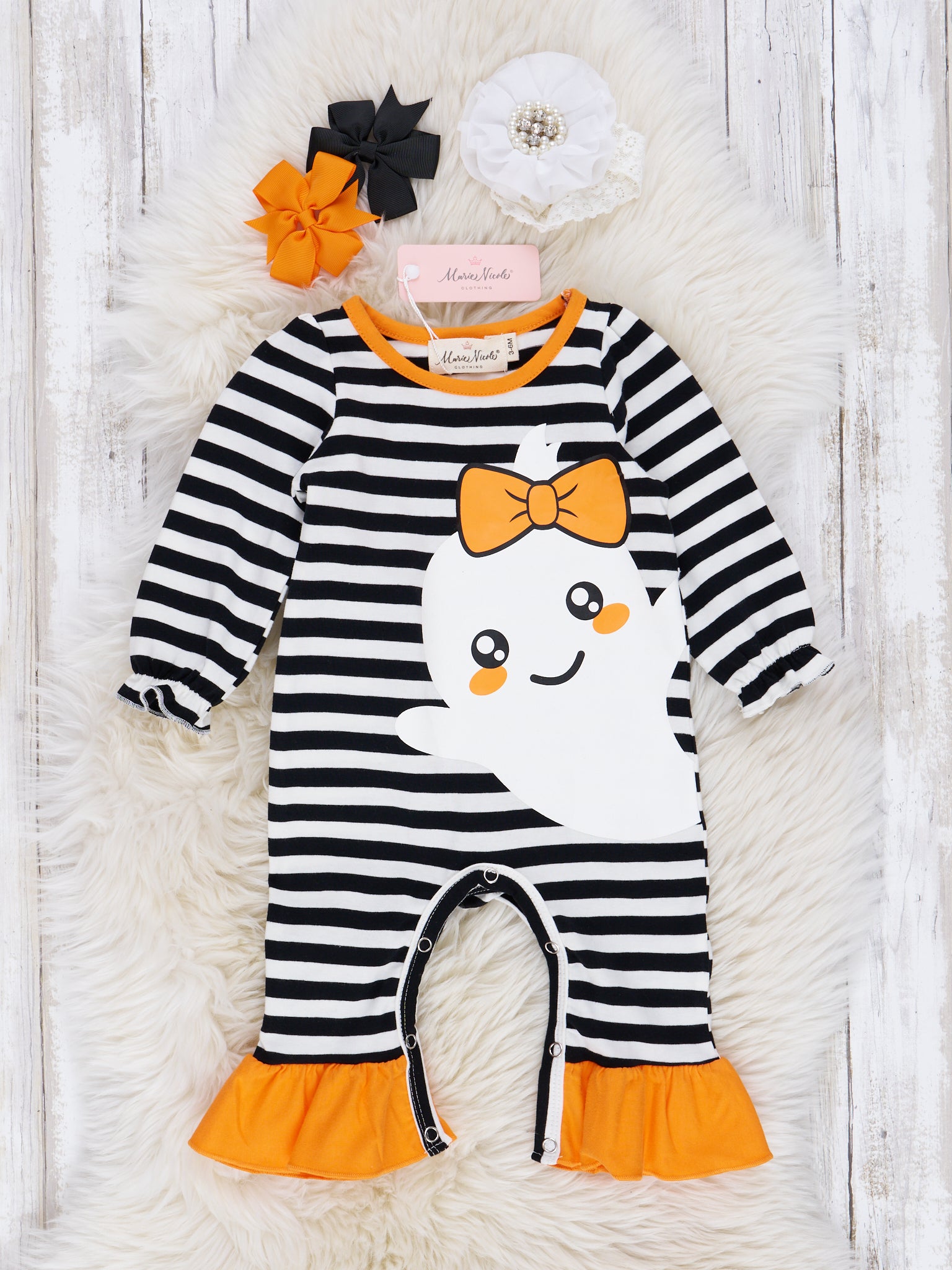 Black & White Stripe Friendly Ghost Ruffle Romper
