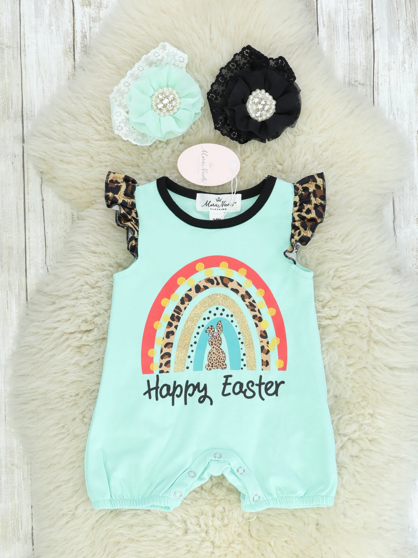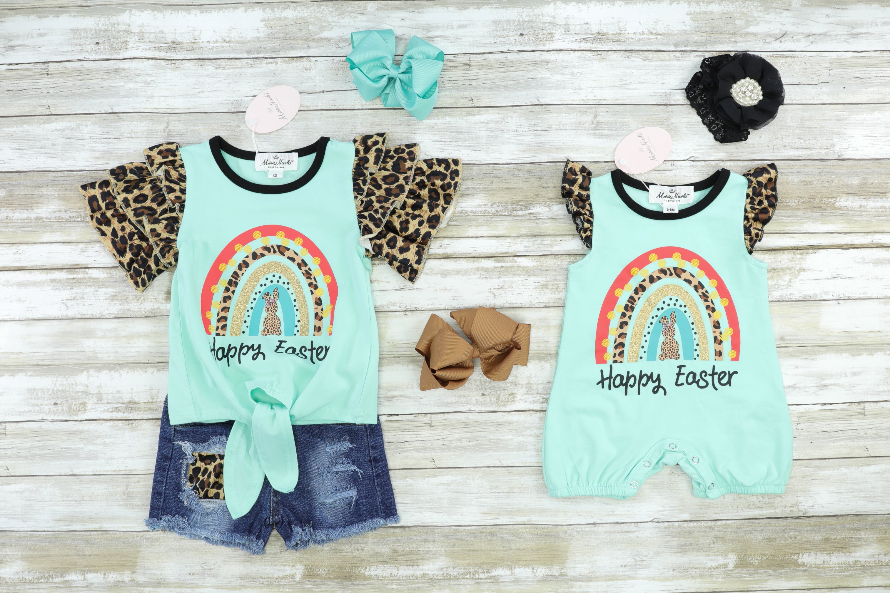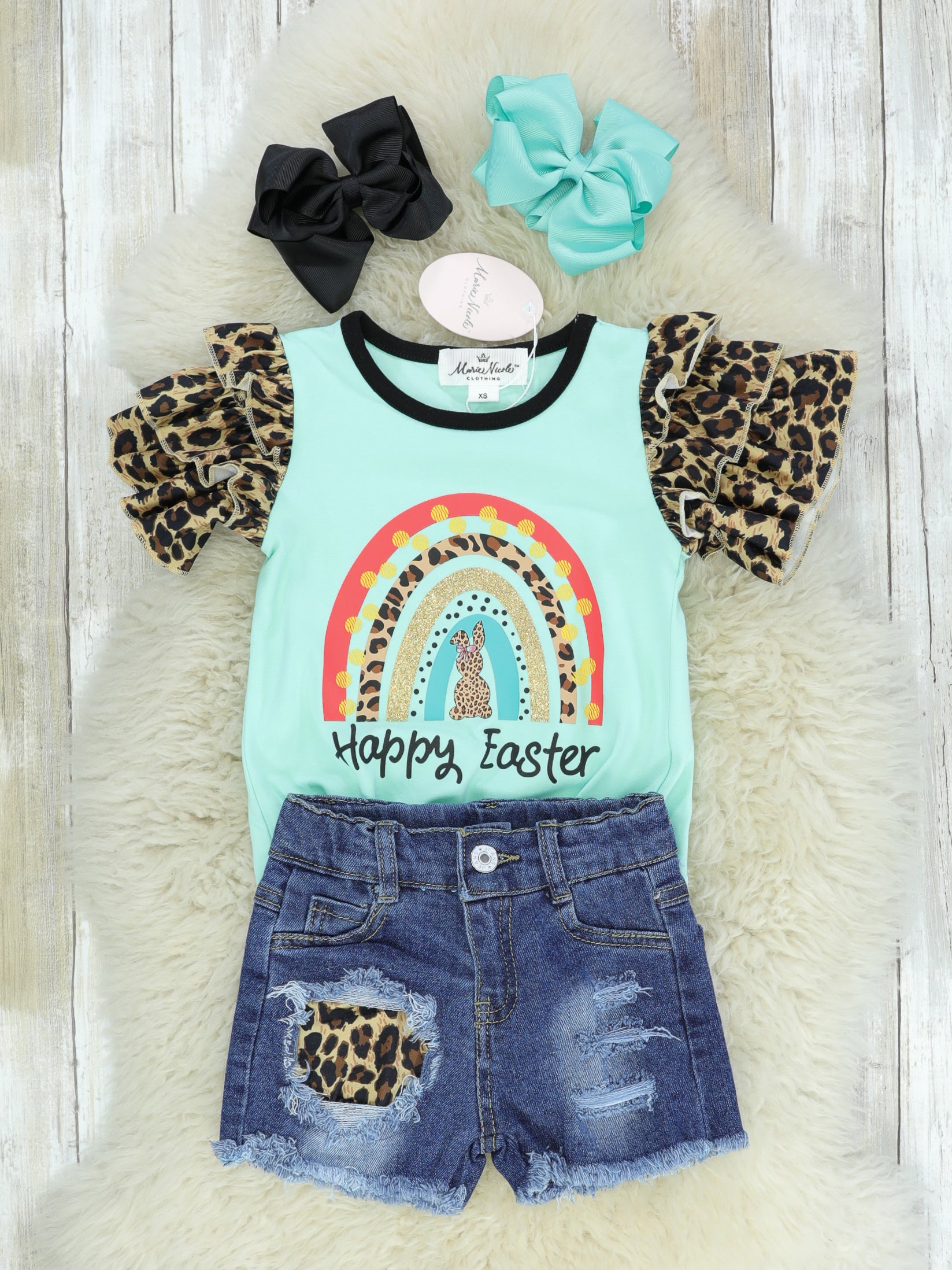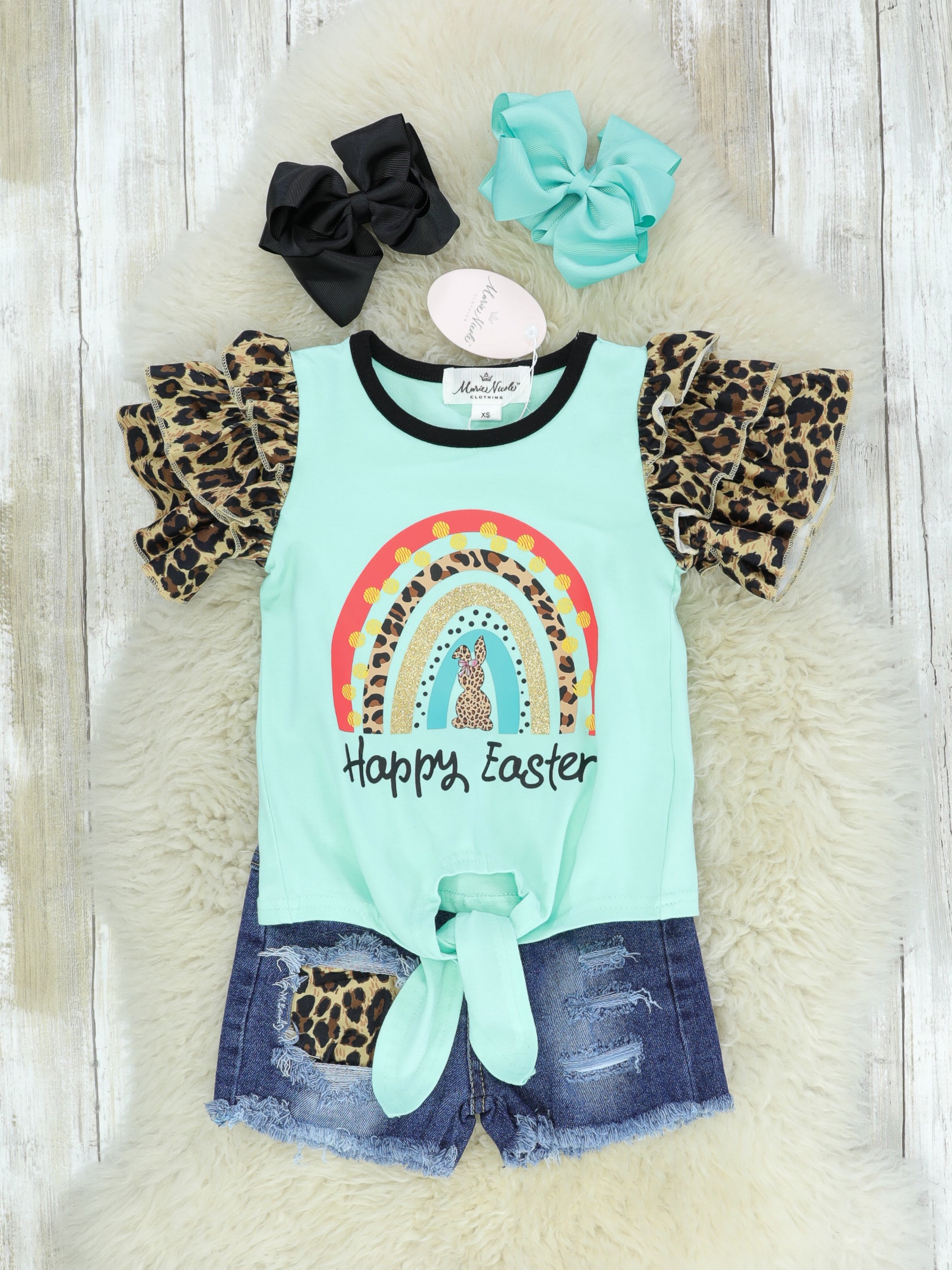 "Happy Easter" Rainbow Ruffle Leopard Denim Outfit