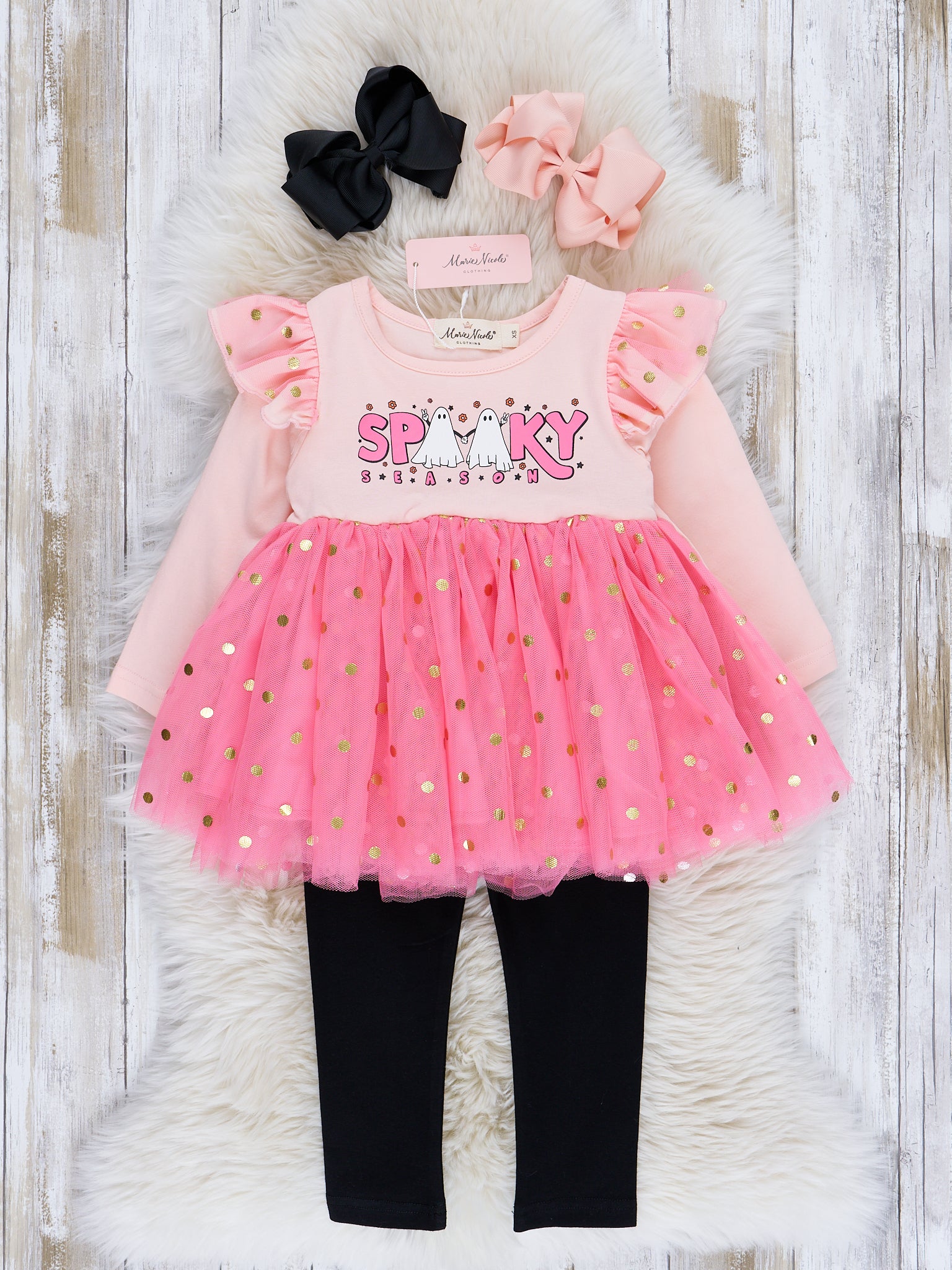 Calling all spooky sisters! This festive sister set has something for each of your sassy girlies! This outfit features shoulder ruffles and a bright blush sparkle tulle peplum detail for twirling right in to spooky season! The cozy leggings add more coverage for cooler months.