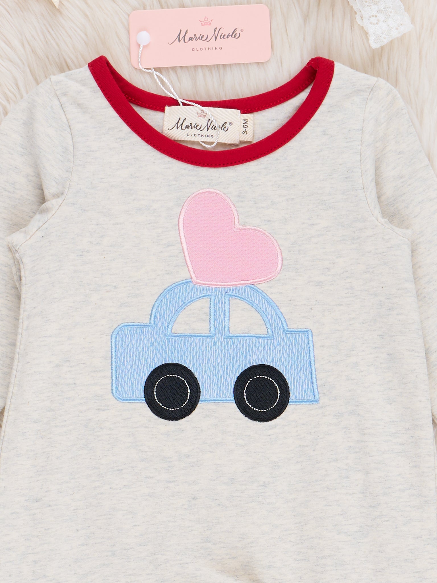 Feel the love with this playful Red Heart Car sibling set by Marie Nicole Clothing! Perfect for Valentine's Day, this girls romper features a yellow striped bodice with an embroidered car and fun vibrant red trim & ruffles. Make a statement and show some love with this stylish and unique romper!