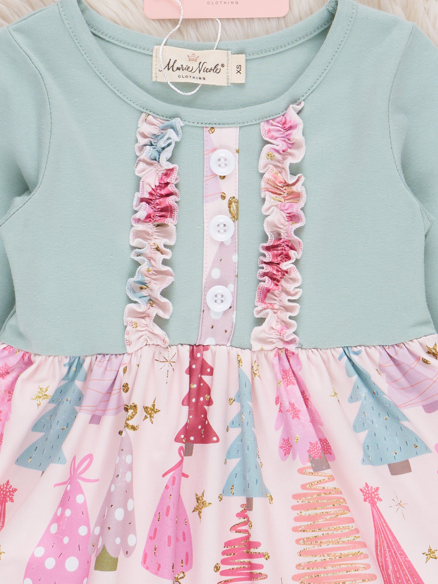 Soft Mint & Pink Christmas Trees Ruffle Dress