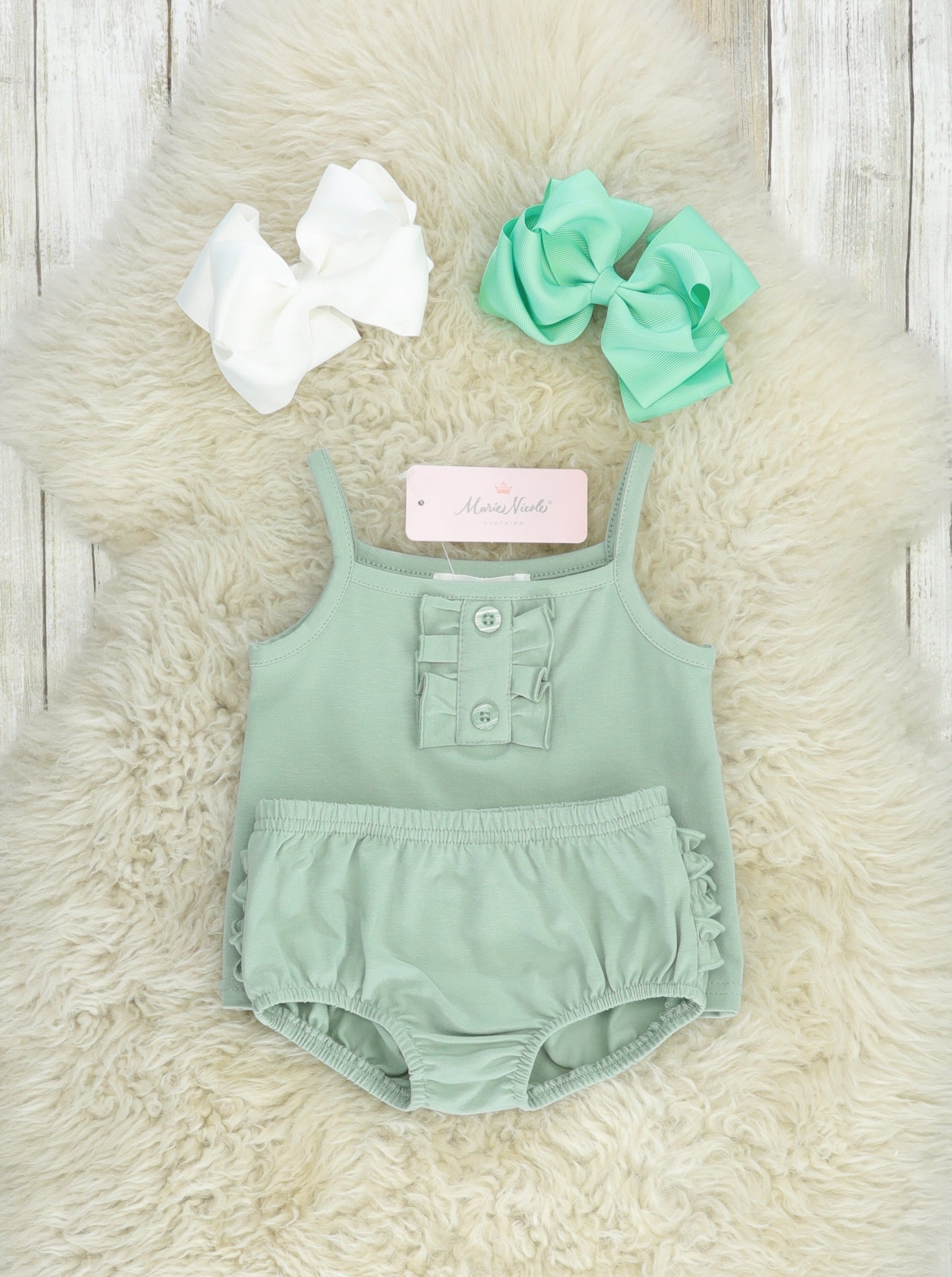 The softest cotton sets for your sweet kiddos! This mint set features a tank with decorative buttons, & bloomers with a ruffle butt, and an elastic waistband for easy changing.