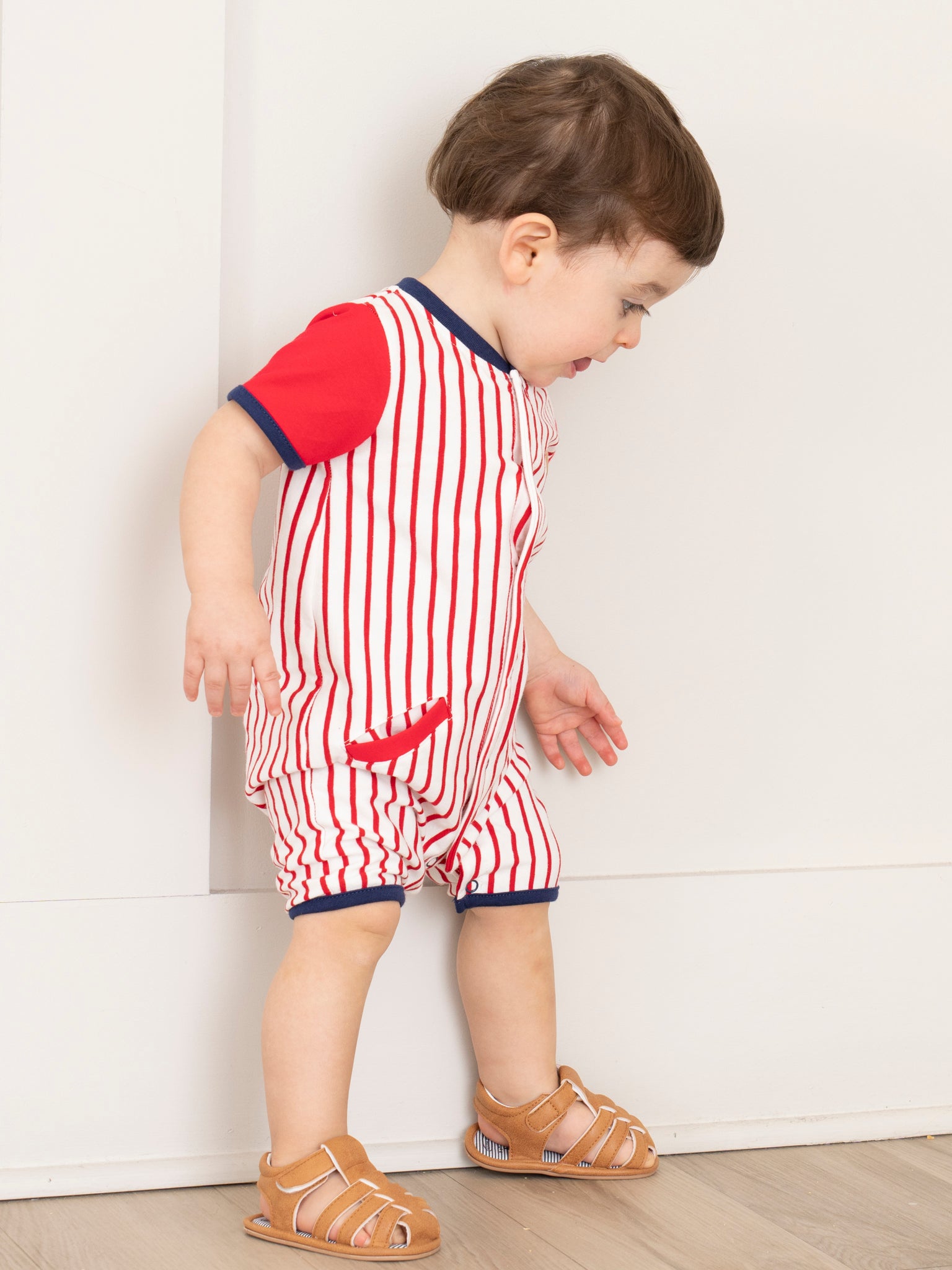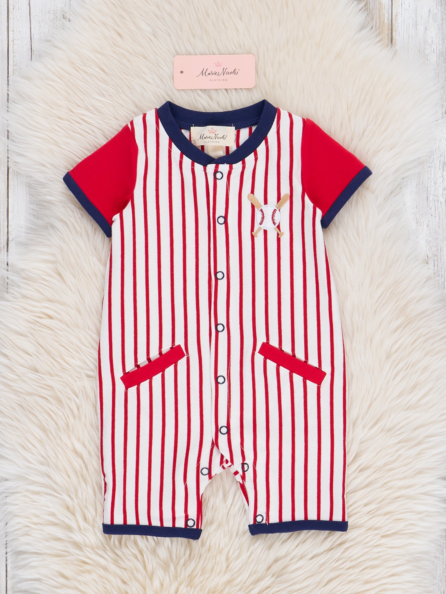 Gear up for the big leagues with our Baseball Stripes Raglan Button Up Romper! This boys romper, designed by Marie Nicole Clothing, features red baseball stripes and raglan sleeves. The button-front detail adds a touch of sophistication, while the red accent pockets provide a pop of color. Perfect for a brother set.