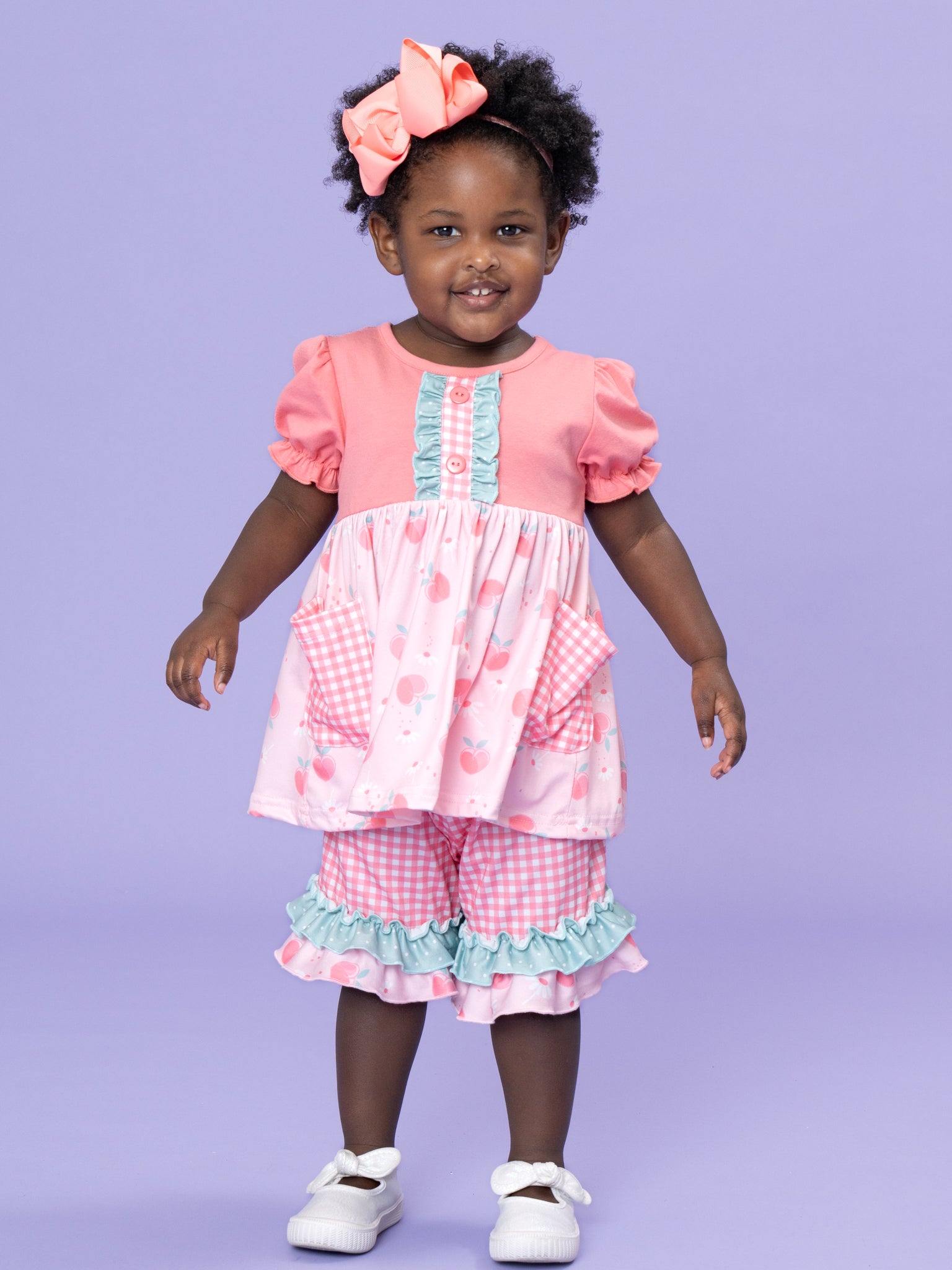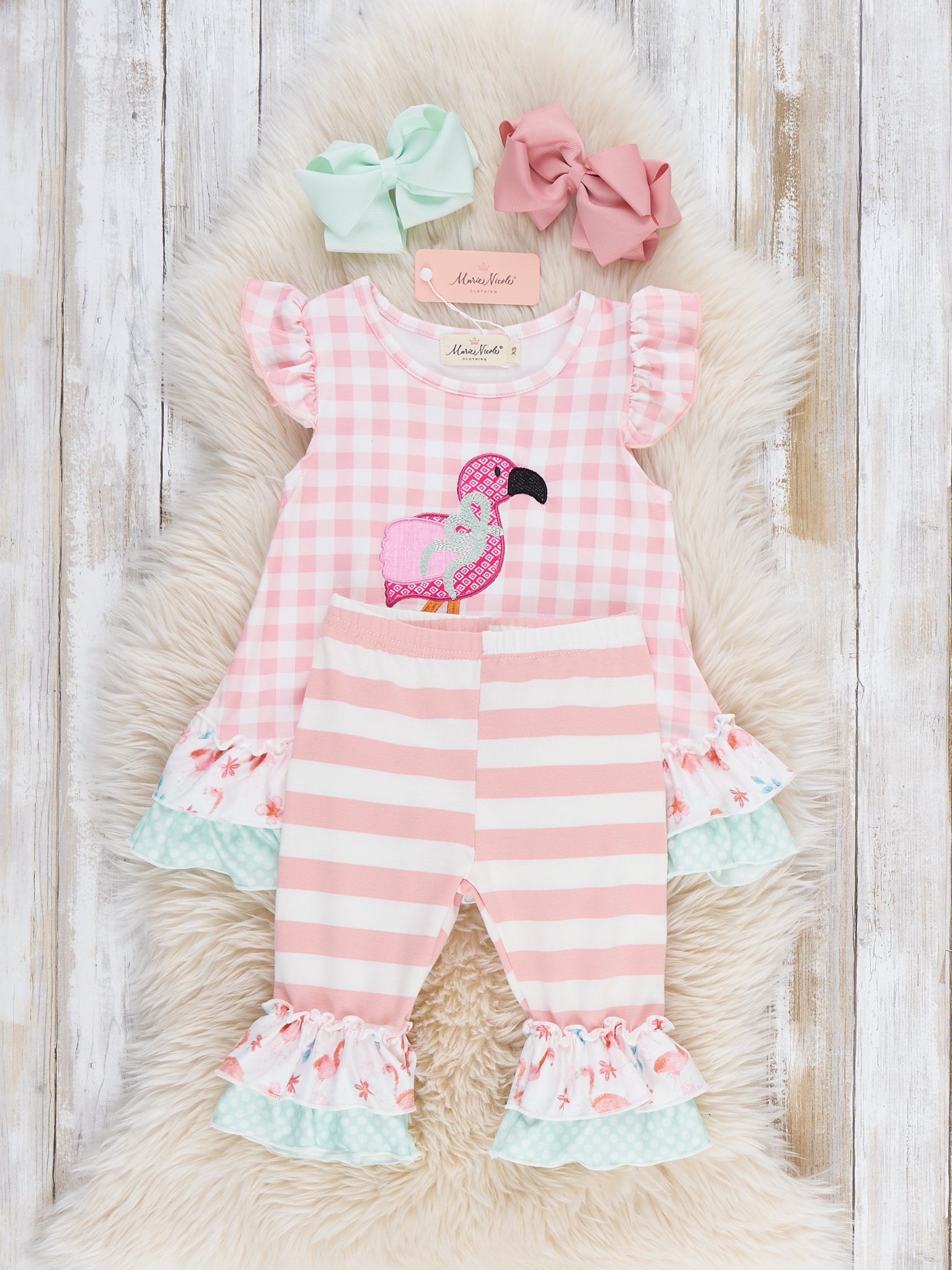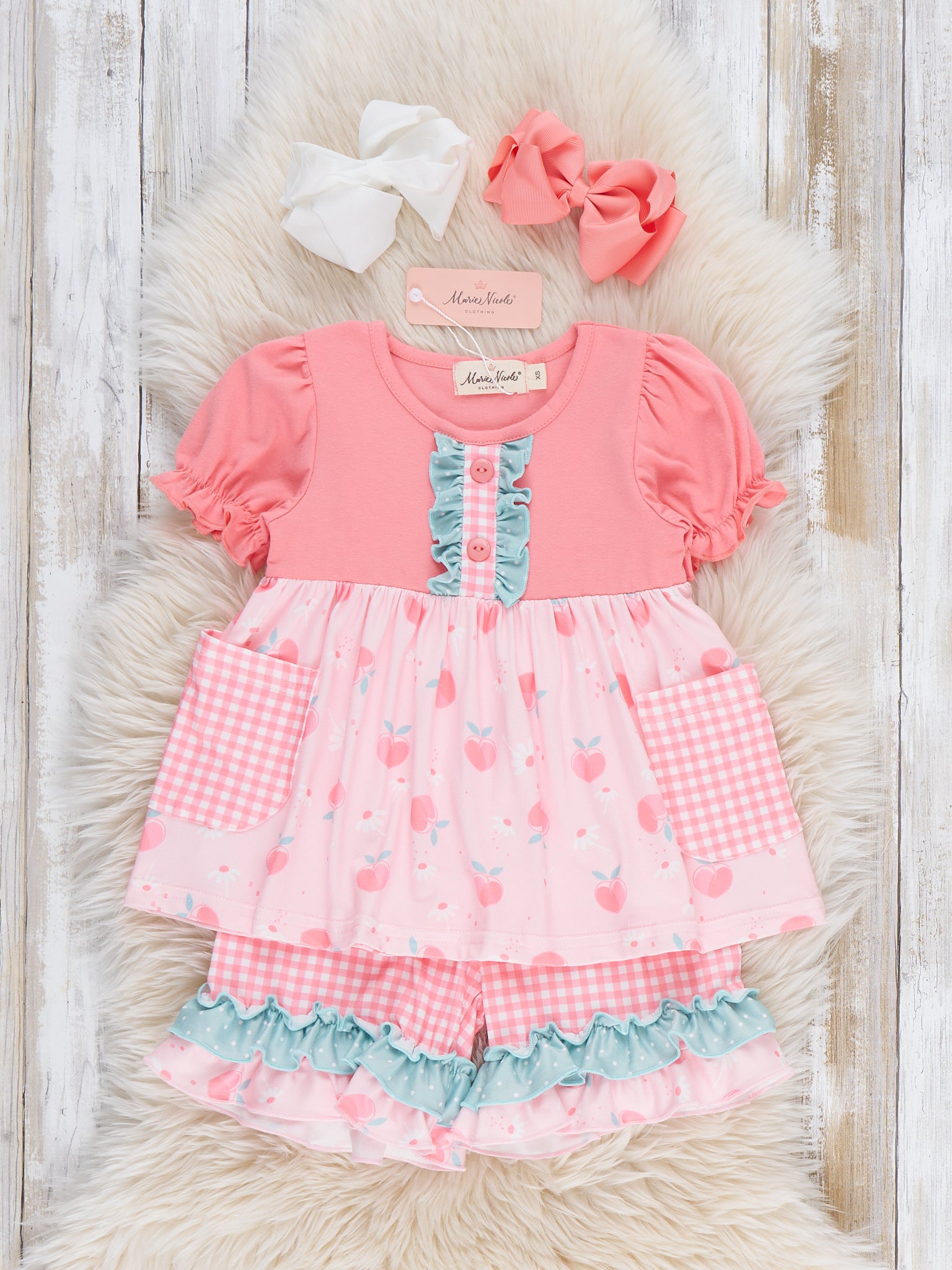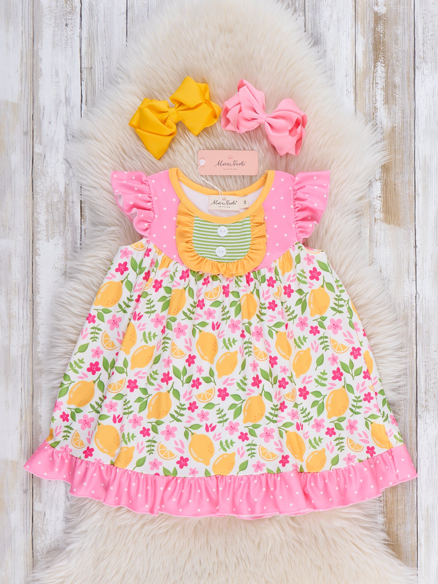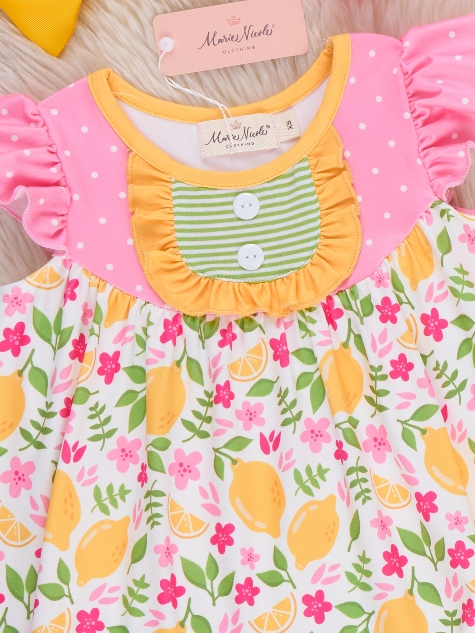 Make a splash with our Tropical Bouquets Striped Swimsuit! This Mom & Me set from Marie Nicole Clothing features a playful peach top with adjustable straps, while the high waist bottoms have a unique peach faux wrap detail over the tropical stripe print. Perfect for the beach or pool, this swimsuit is a must-have for summer fun!
