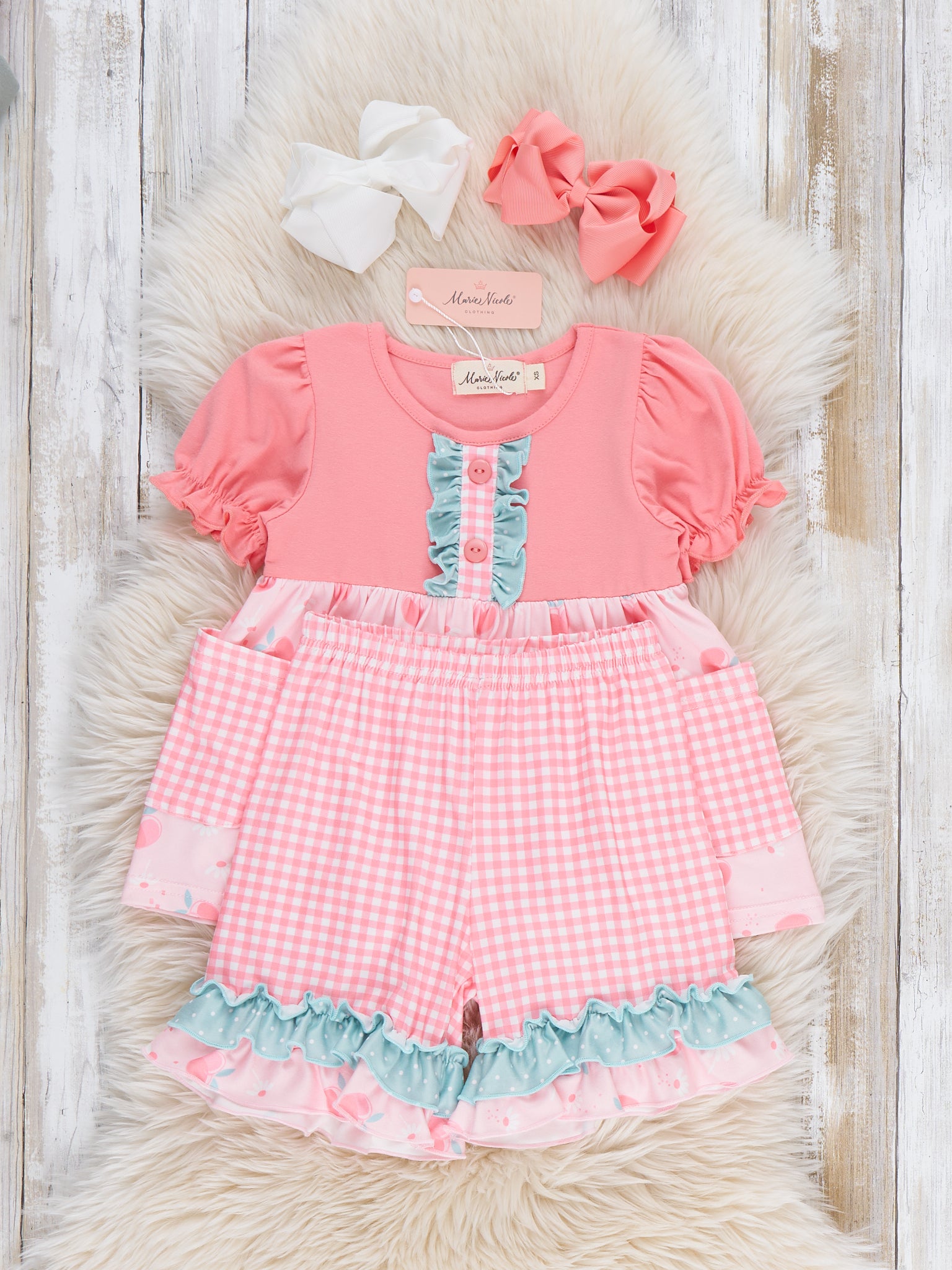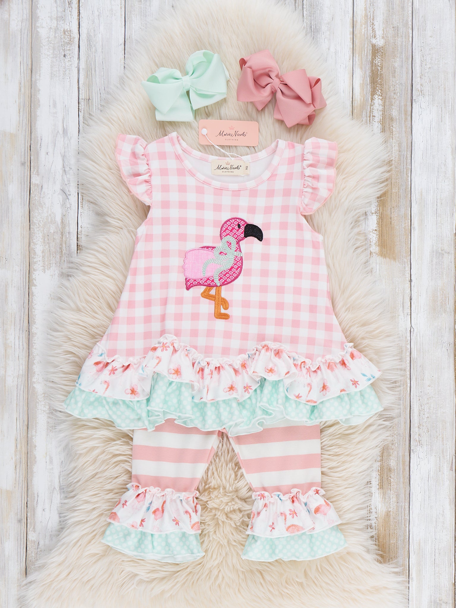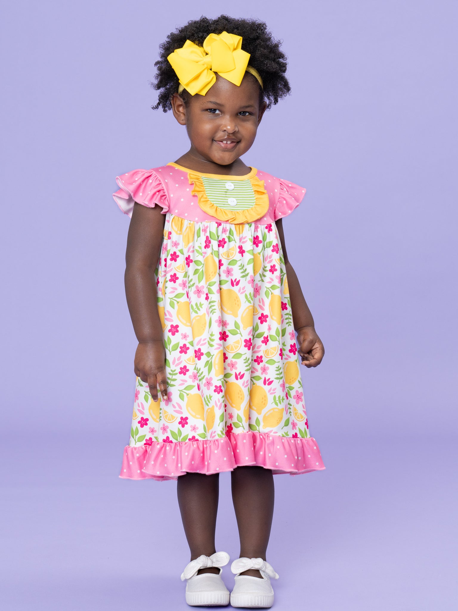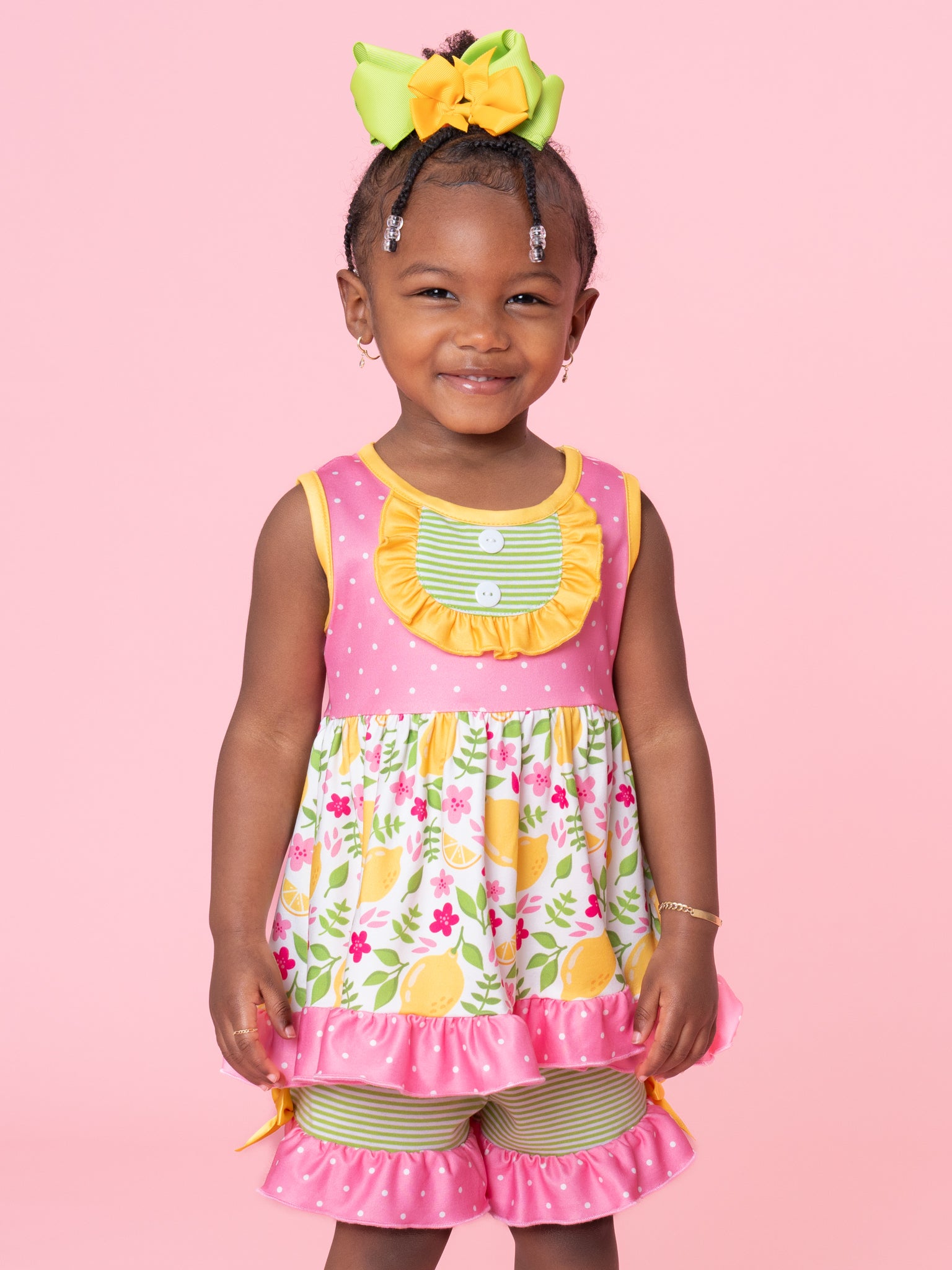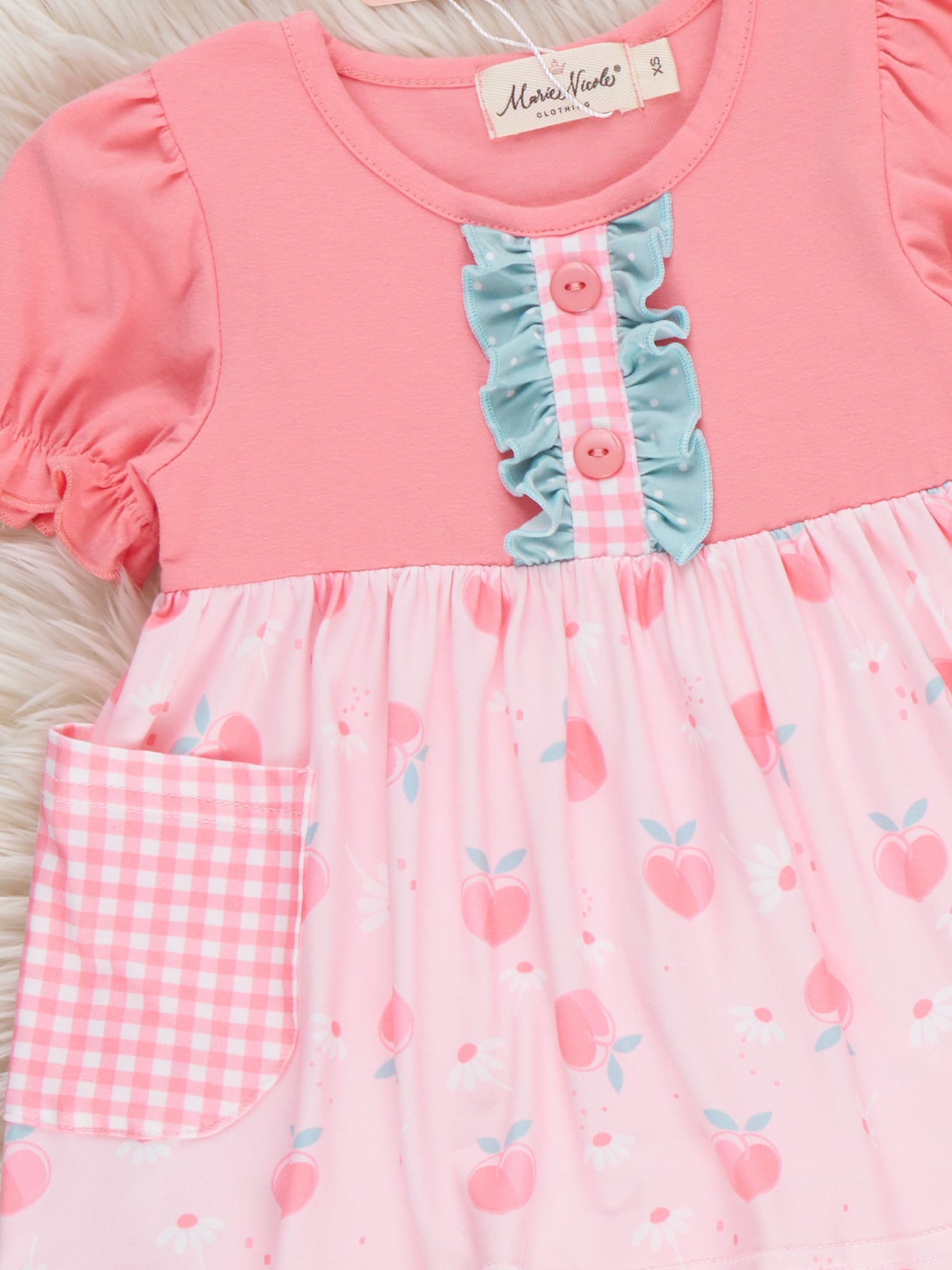 Make a splash with our Tropical Bouquets Striped Swimsuit! This Mom & Me set from Marie Nicole Clothing features a playful peach top with adjustable straps, while the high waist bottoms have a unique peach faux wrap detail over the tropical stripe print. Perfect for the beach or pool, this swimsuit is a must-have for summer fun!