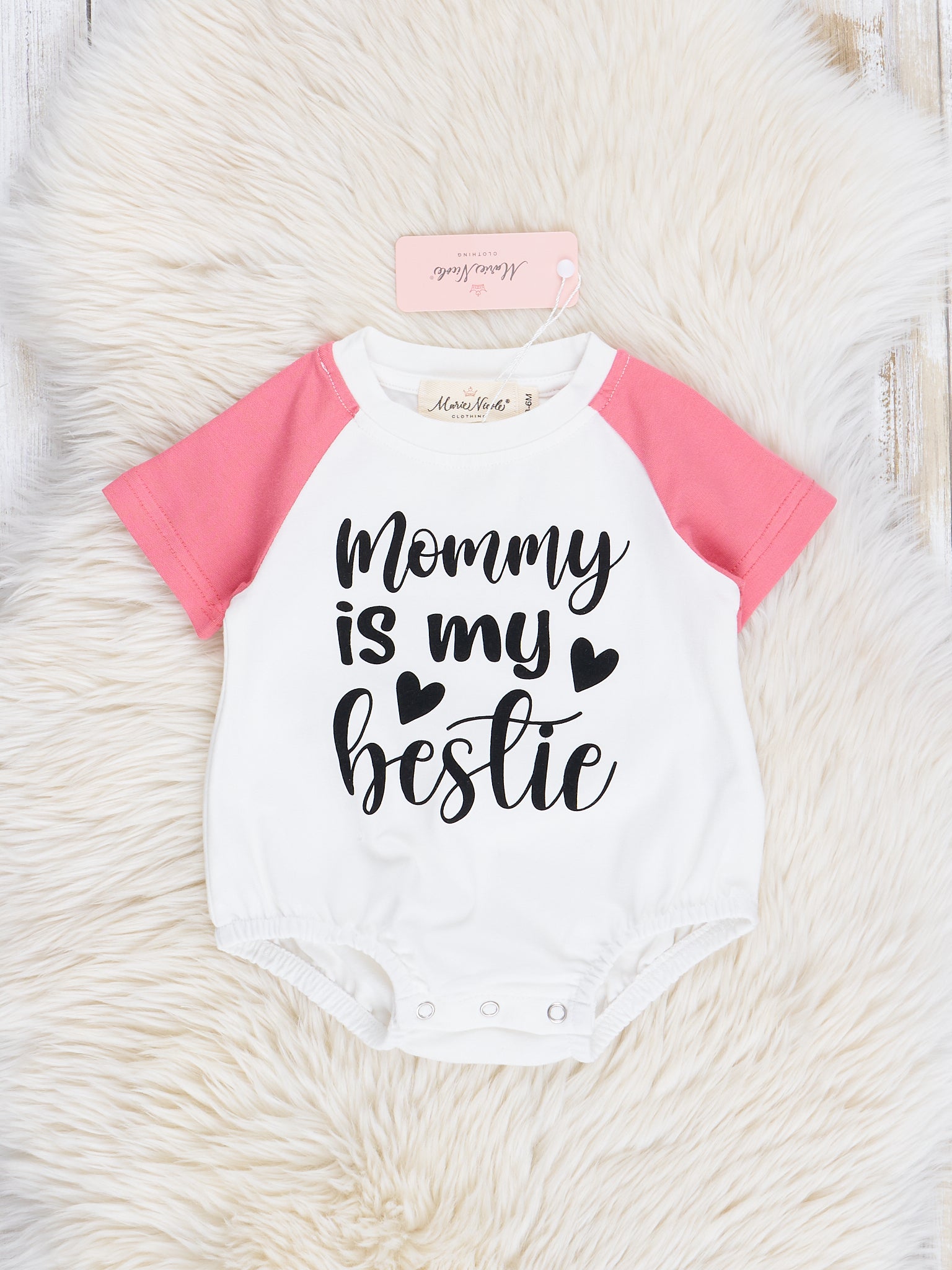 Match with your little one in this adorable Mom & Me Pink Bestie Set, featuring the playful message "Mommy is my bestie". Made with a cute pink color, this set is perfect for bonding and having fun with your mini-me.