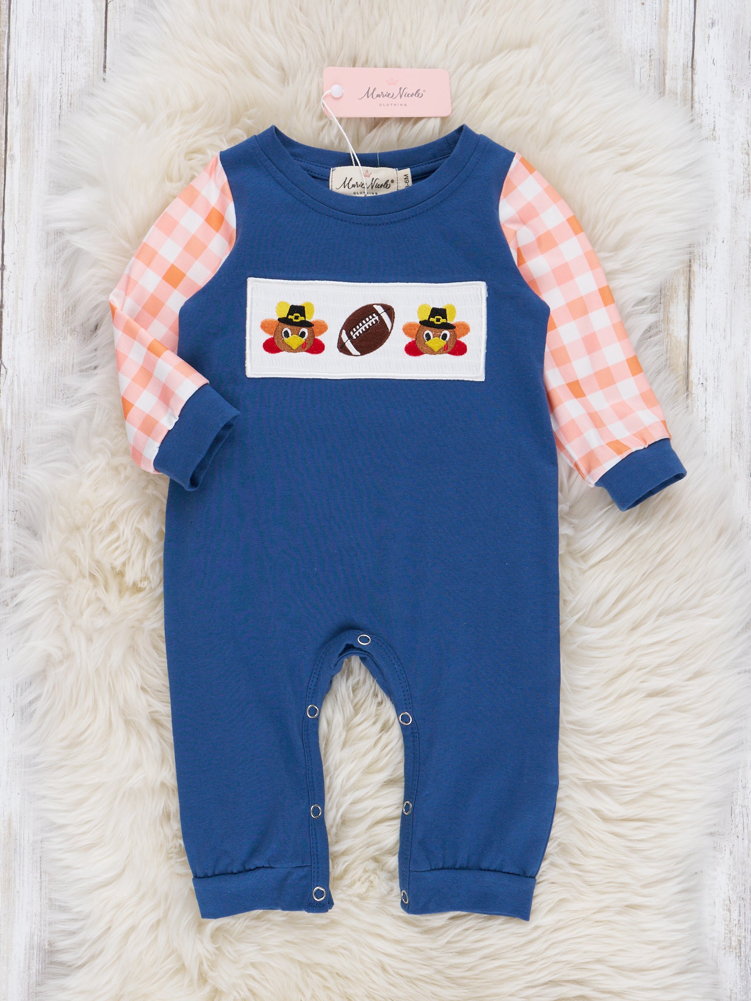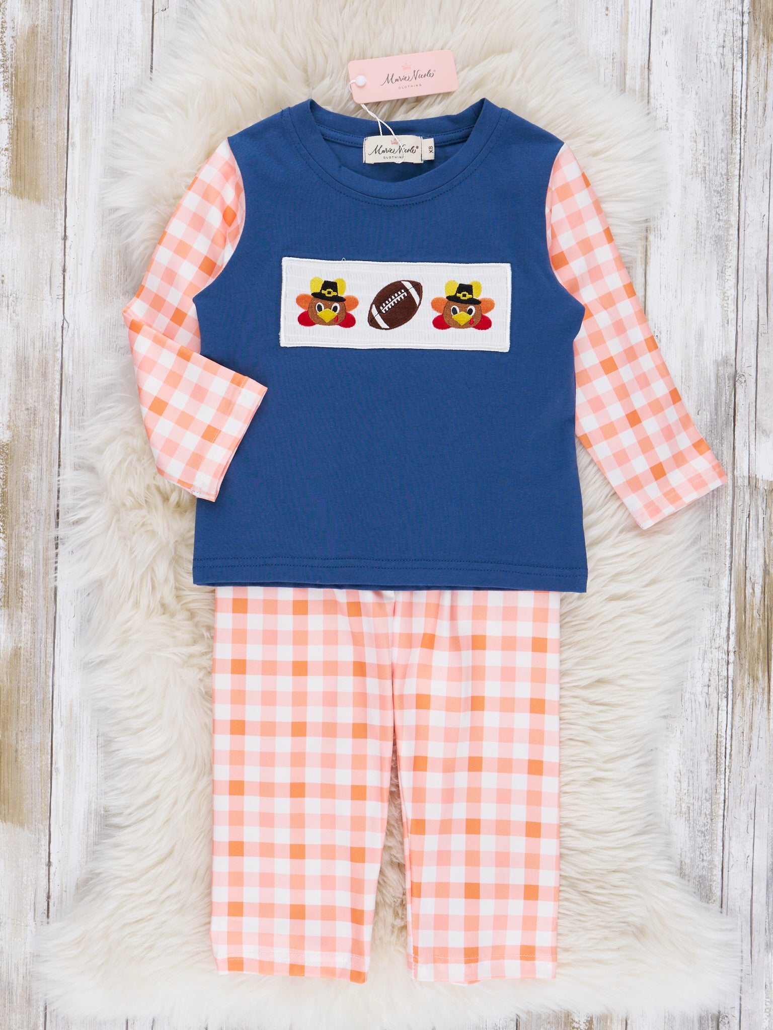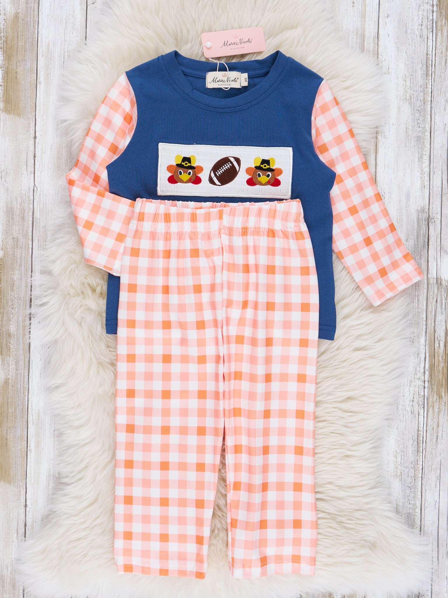 Navy & Orange Plaid Smocked Football Ruffle Outfit