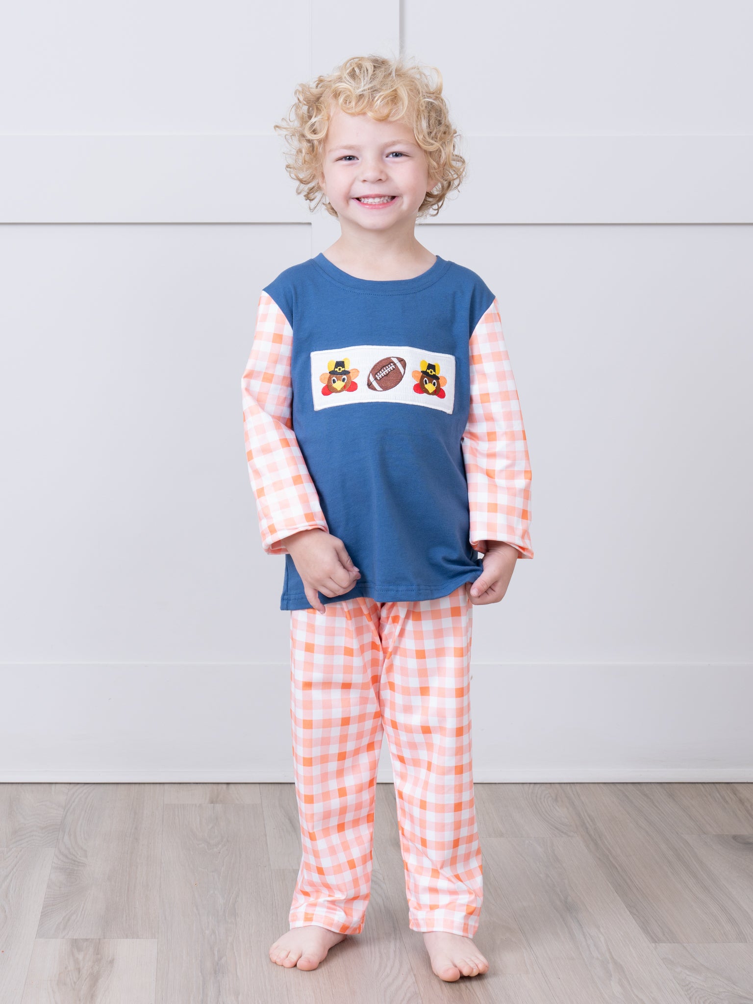 Home › Navy & Orange Plaid Smocked Football Sibling Set