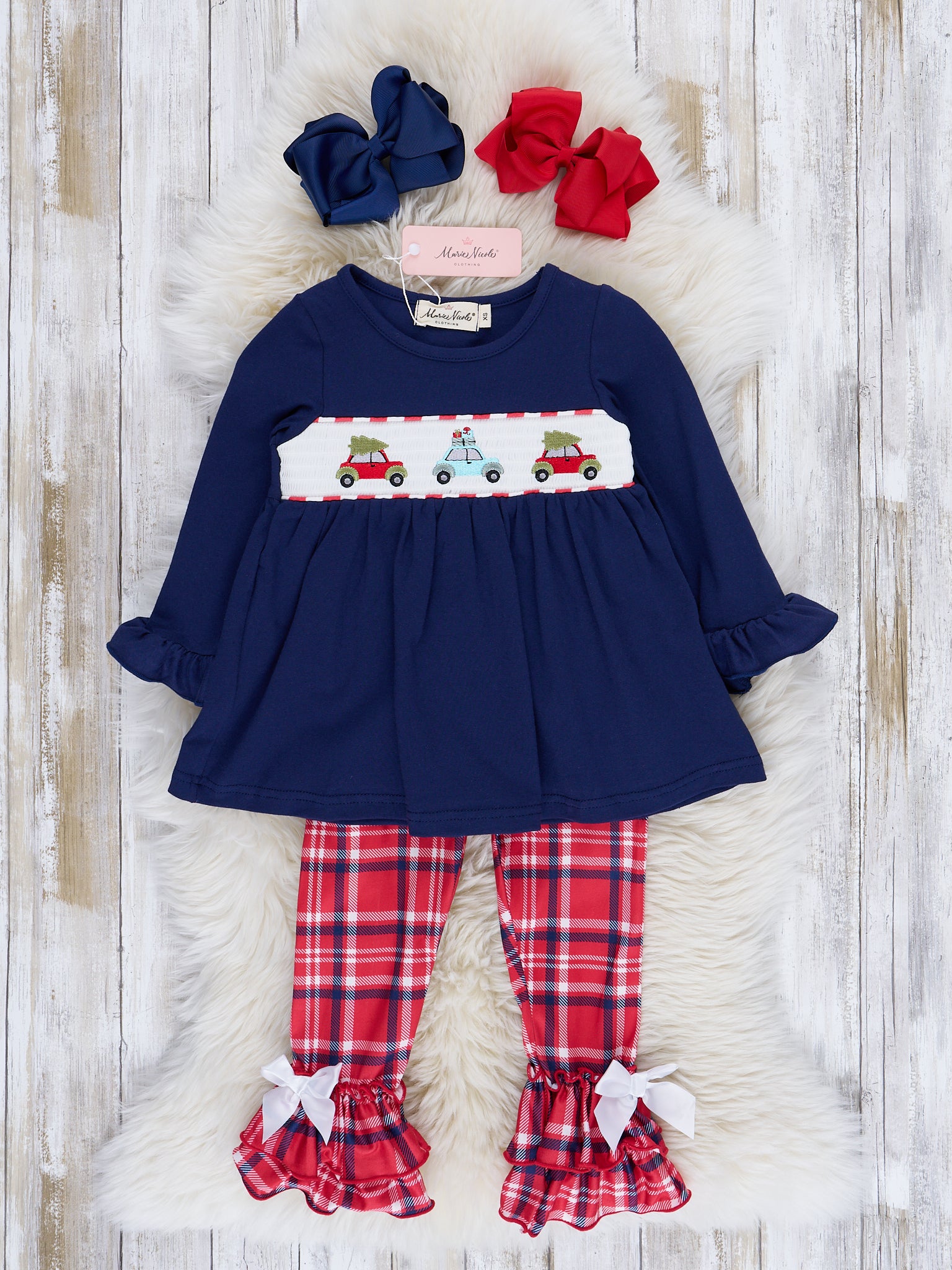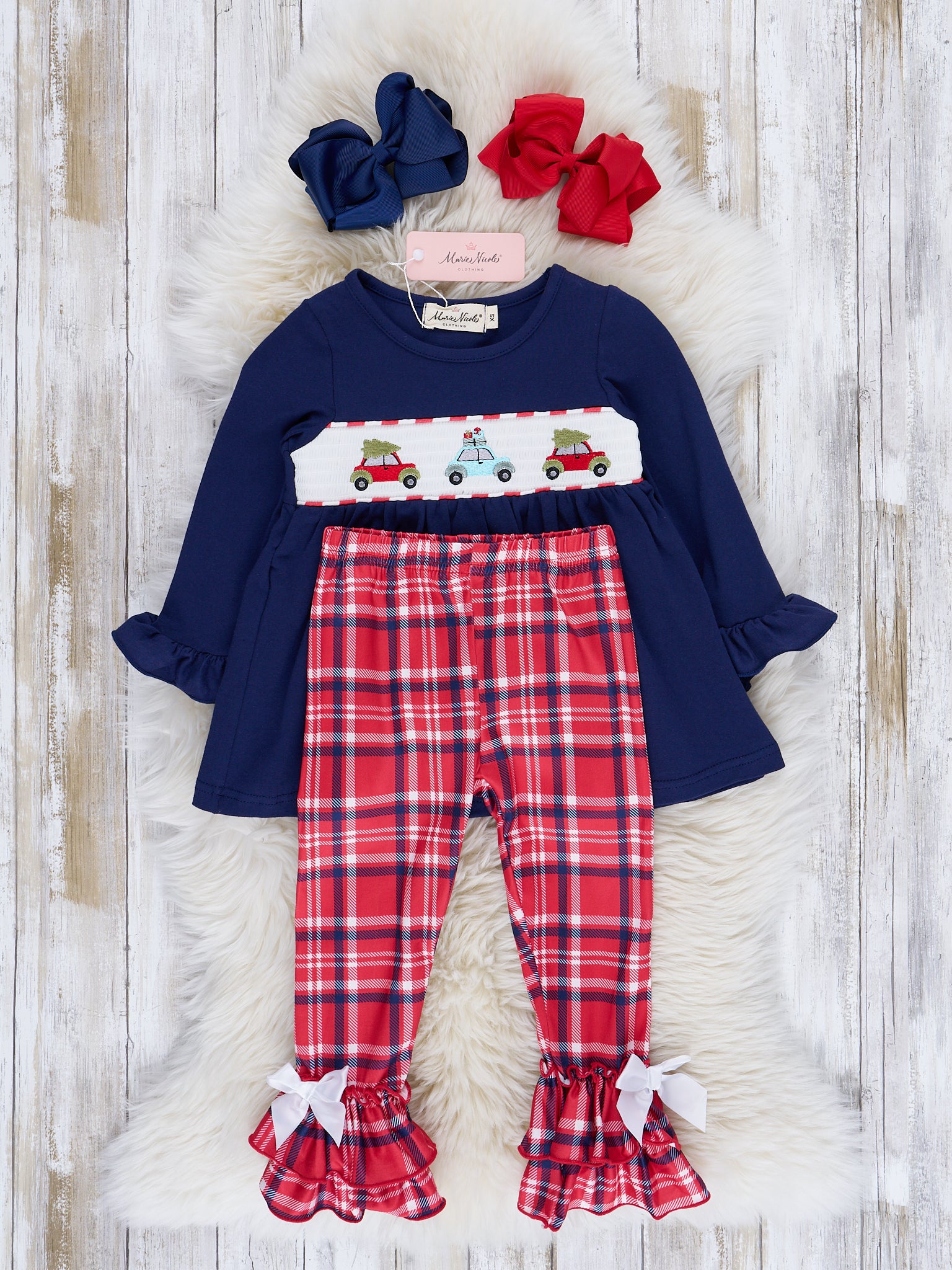 Navy & Red Holiday Plaid Smocked Ruffle Outfit