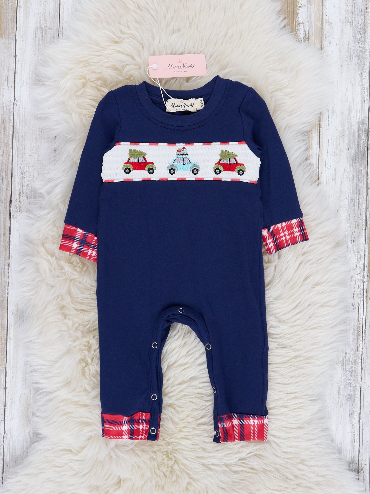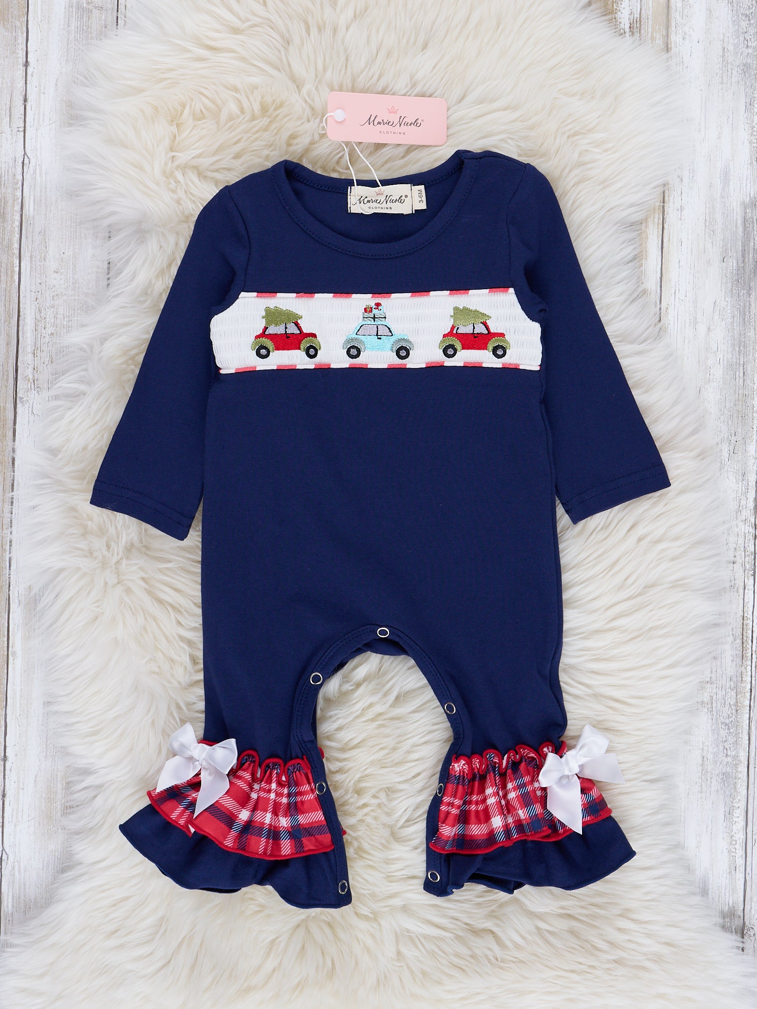 Navy & Red Holiday Plaid Smocked Ruffle Romper