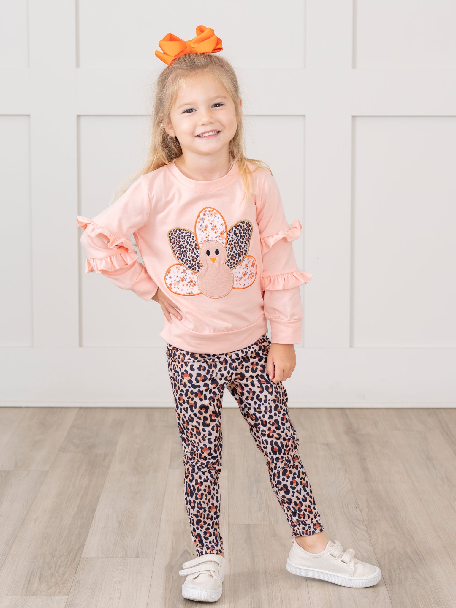 The Feathered & Fabulous Ruffle Outfit blends fancy, fun, and comfort. This two-piece set from Marie Nicole Clothing features an embroidered turkey, tiered ruffled sleeves, and marvelous leopard print. Made with a comfy, loungewear fit, this outfit is perfect for fun photos, Thanksgiving dinners, or resting after the festivities!