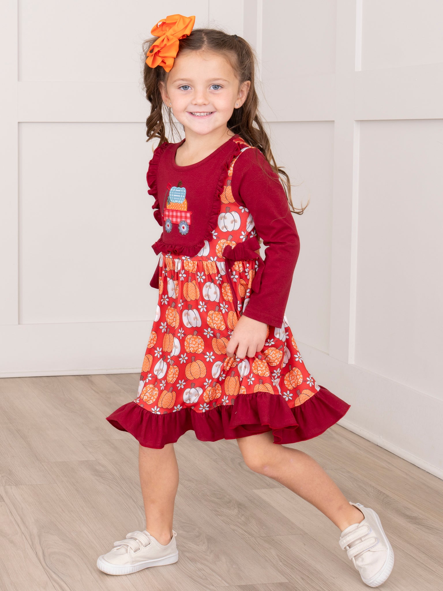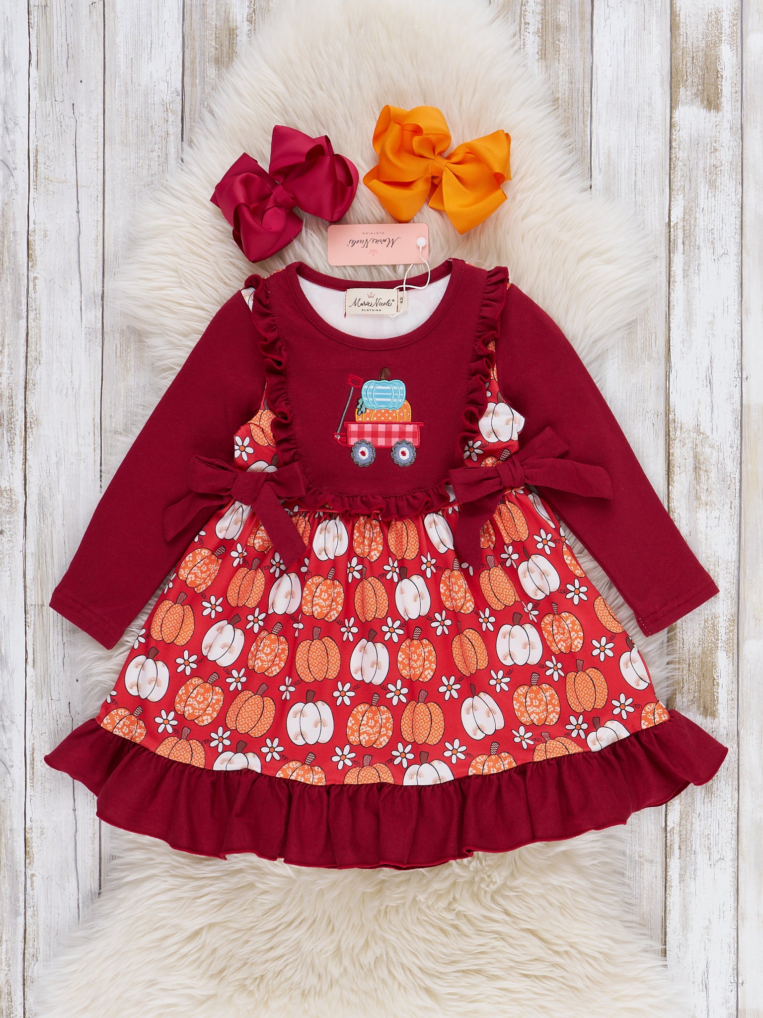 Maroon Pumpkin Wagon Embroidered Bow Dress