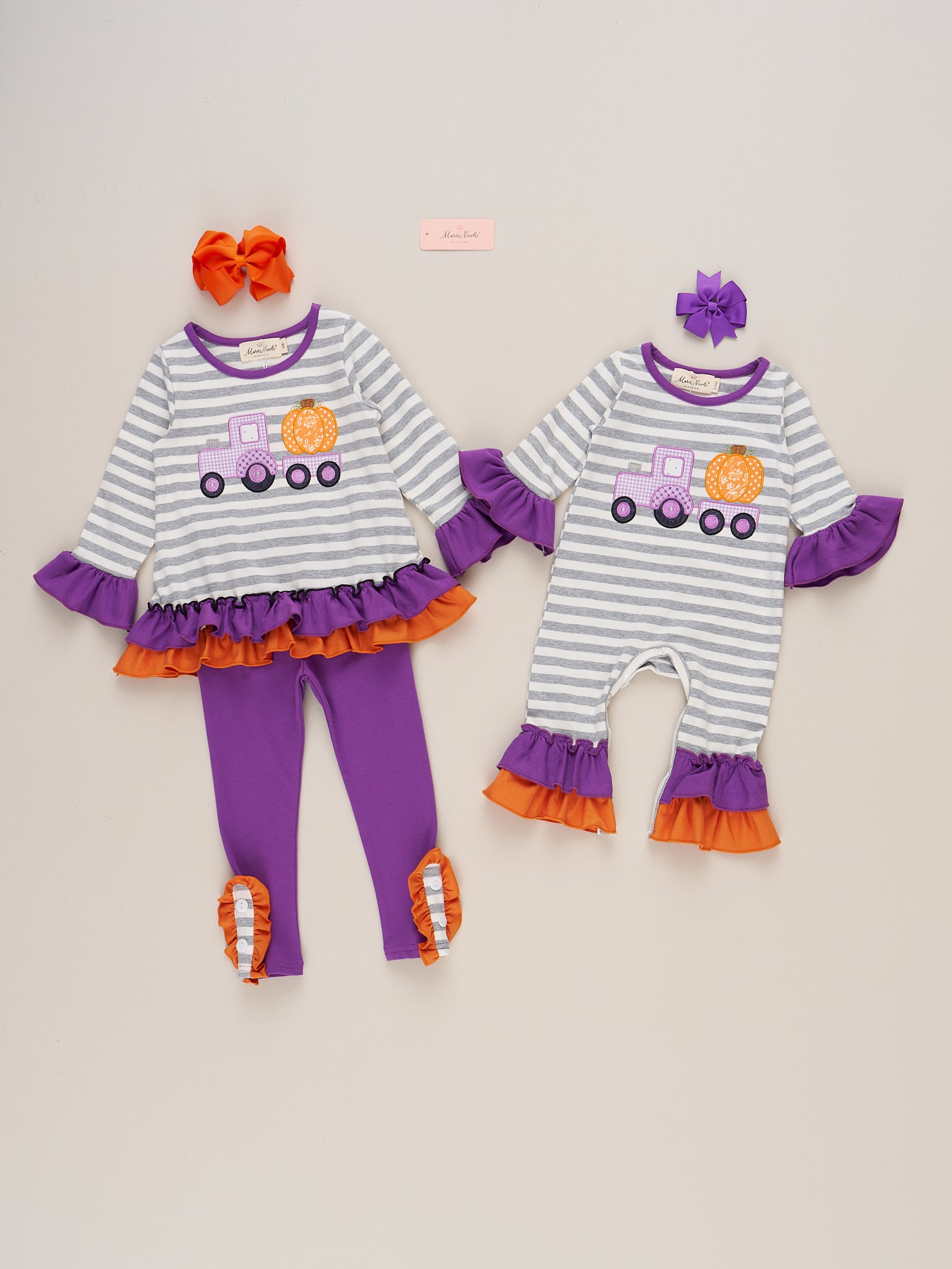 Haul home the best pumpkins with the Pumpkin Haulin’ Cutie Ruffle Romper! This one-piece from Marie Nicole Clothing features festive ruffles and an embroidered truck, complete with a pumpkin load. Made with soft, stretchy material, the purple, orange, and grey fabric gives the perfect spooky flare as your little girl visits the pumpkin patch, poses for fall photos, or prepares for Halloween!