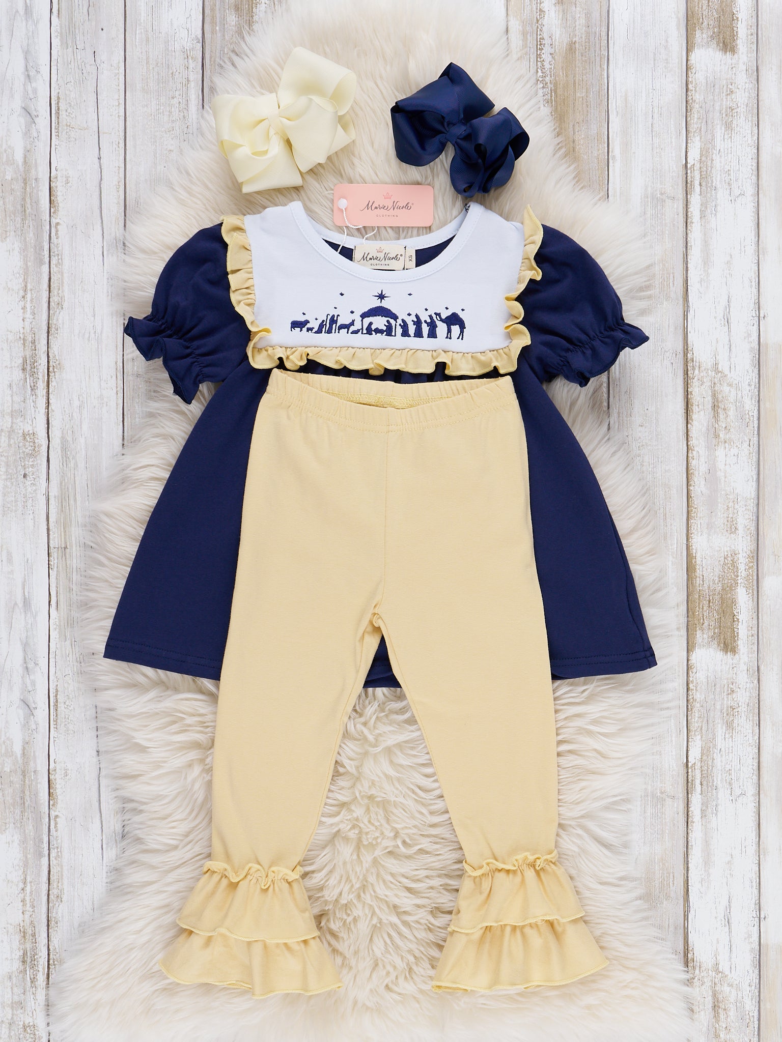 Experience a playful twist on the classic Christmas Nativity with our Nativity Embroidered Ruffle Dress. Perfect for sisters, this girls outfit features an embroidered Nativity scene on a navy blue top with a fun and sweet yellow ruffle trim paired with yellow ruffle bell leggings. Add a touch of whimsy to your holiday wardrobe!