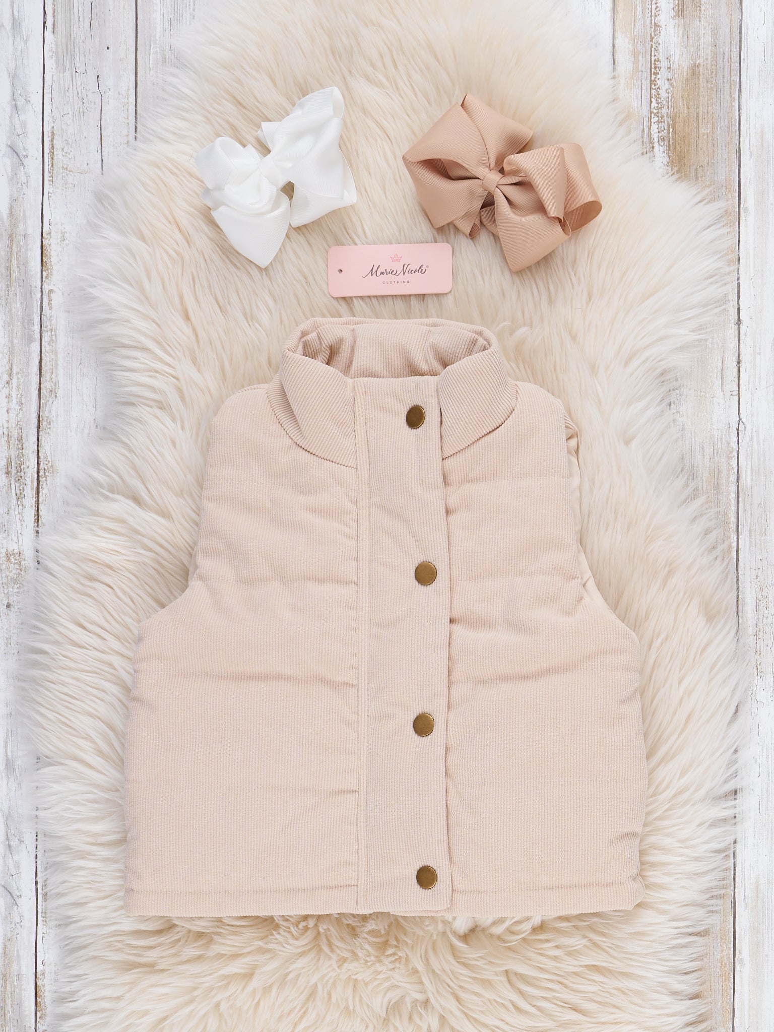 The Corduroy Puffer Vest in Beige by Marie Nicole features a cozy, quilted construction with snap-button closures and a high neckline for added warmth. Its sleeveless design makes it a perfect layering piece for transitional weather, offering versatility and comfort.