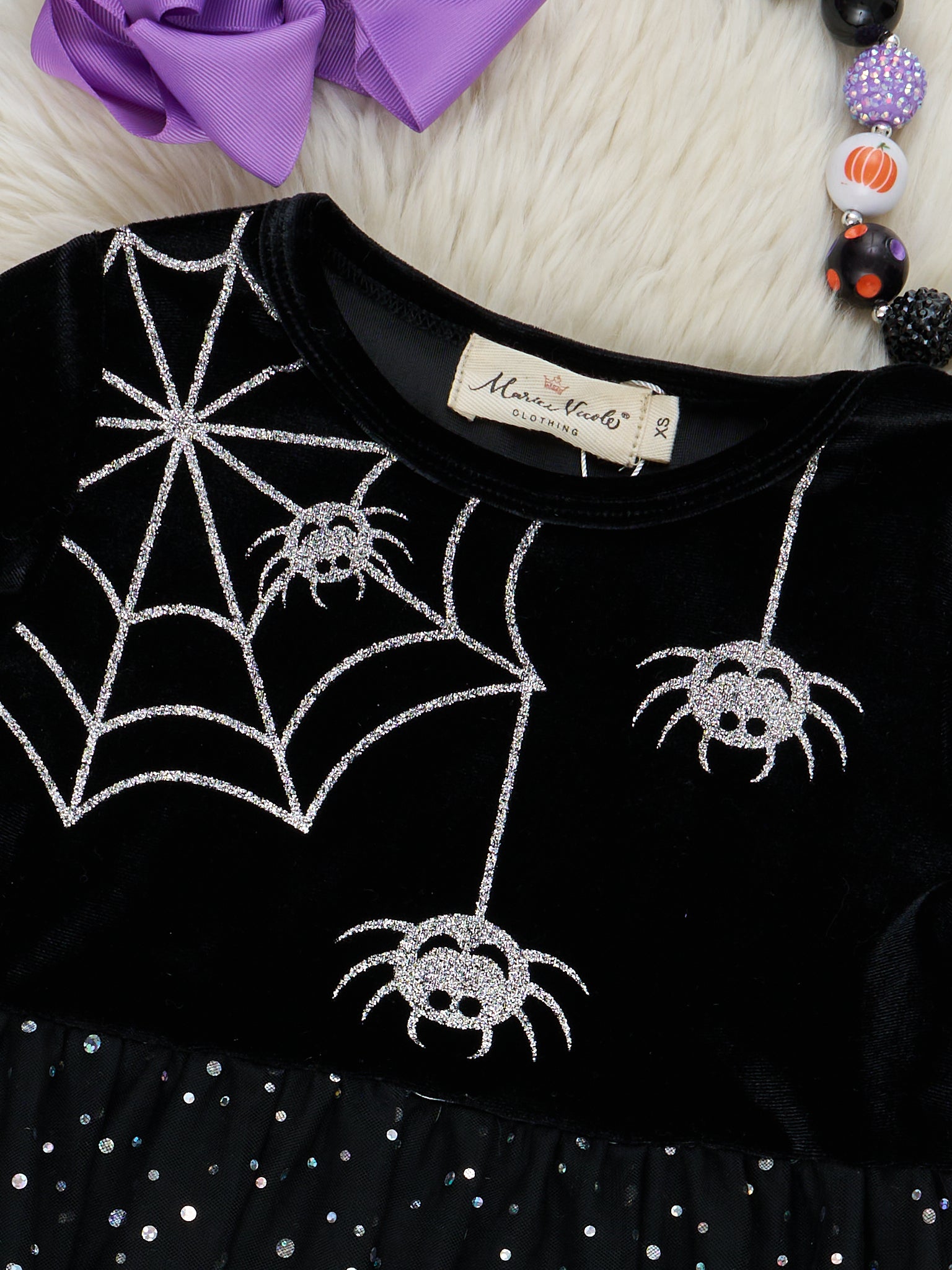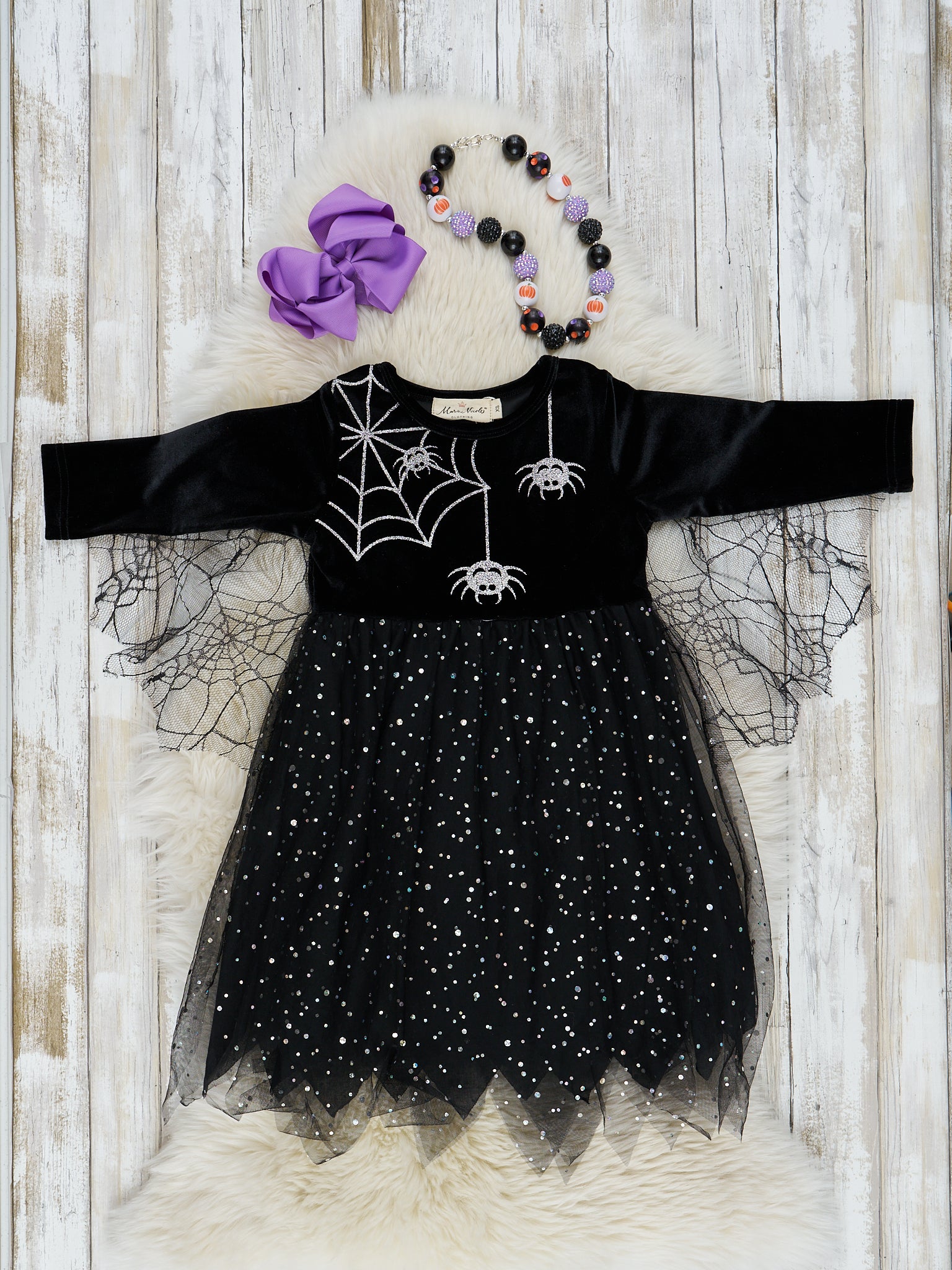 For your little girl who loves all things spooky + creepy crawly. This adorable sparkle tulle dress features spider design with long sleeves and shark bite tulle skirt.