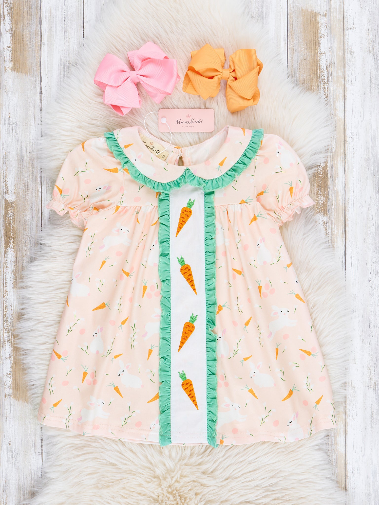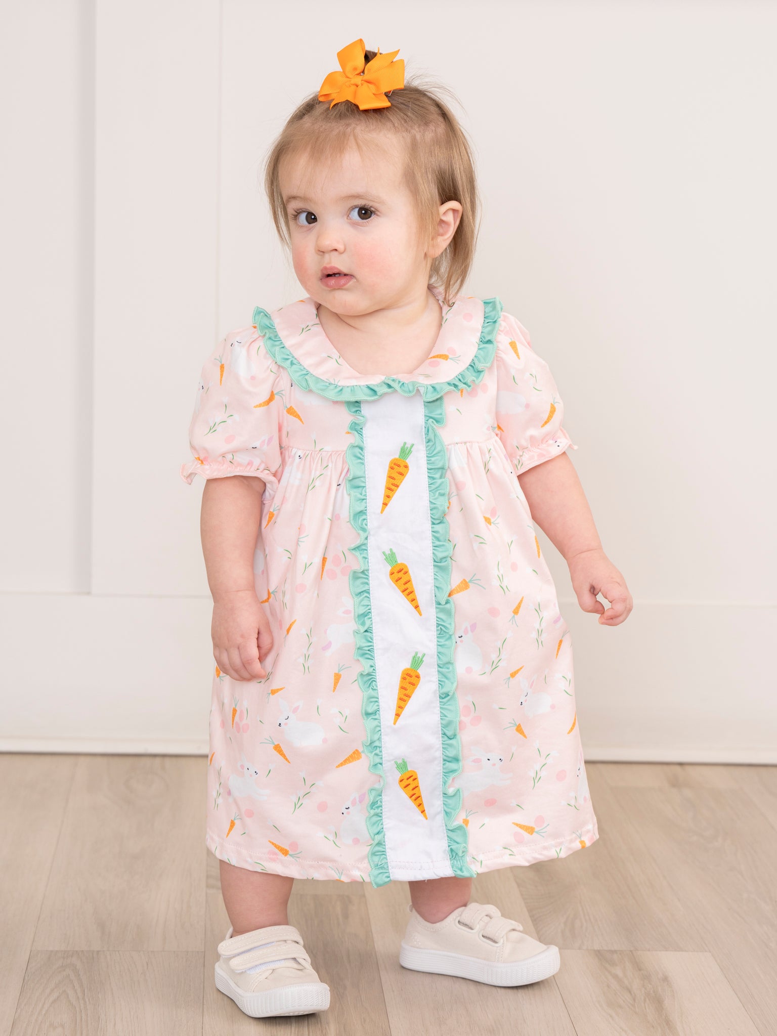 Peach & Green Embroidered Carrots Ruffle Dress