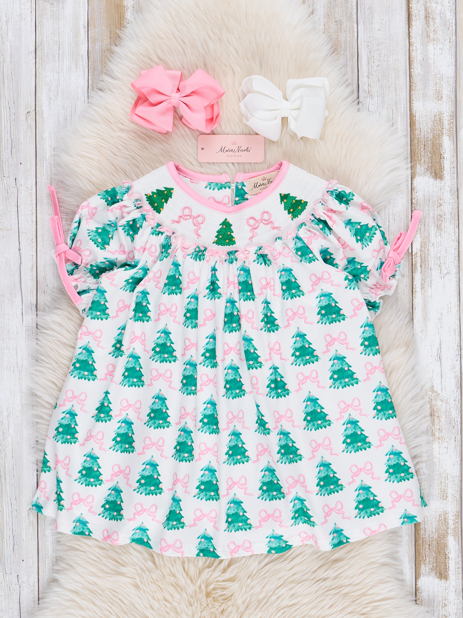 Pink Bows & Evergreens Smocked Dress