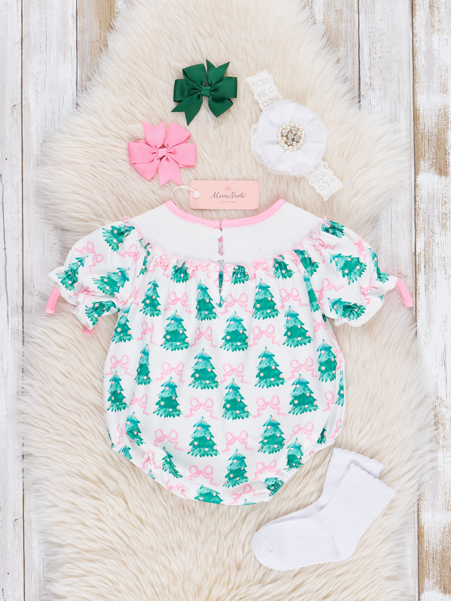 Pink Bows & Evergreens Smocked Bubble