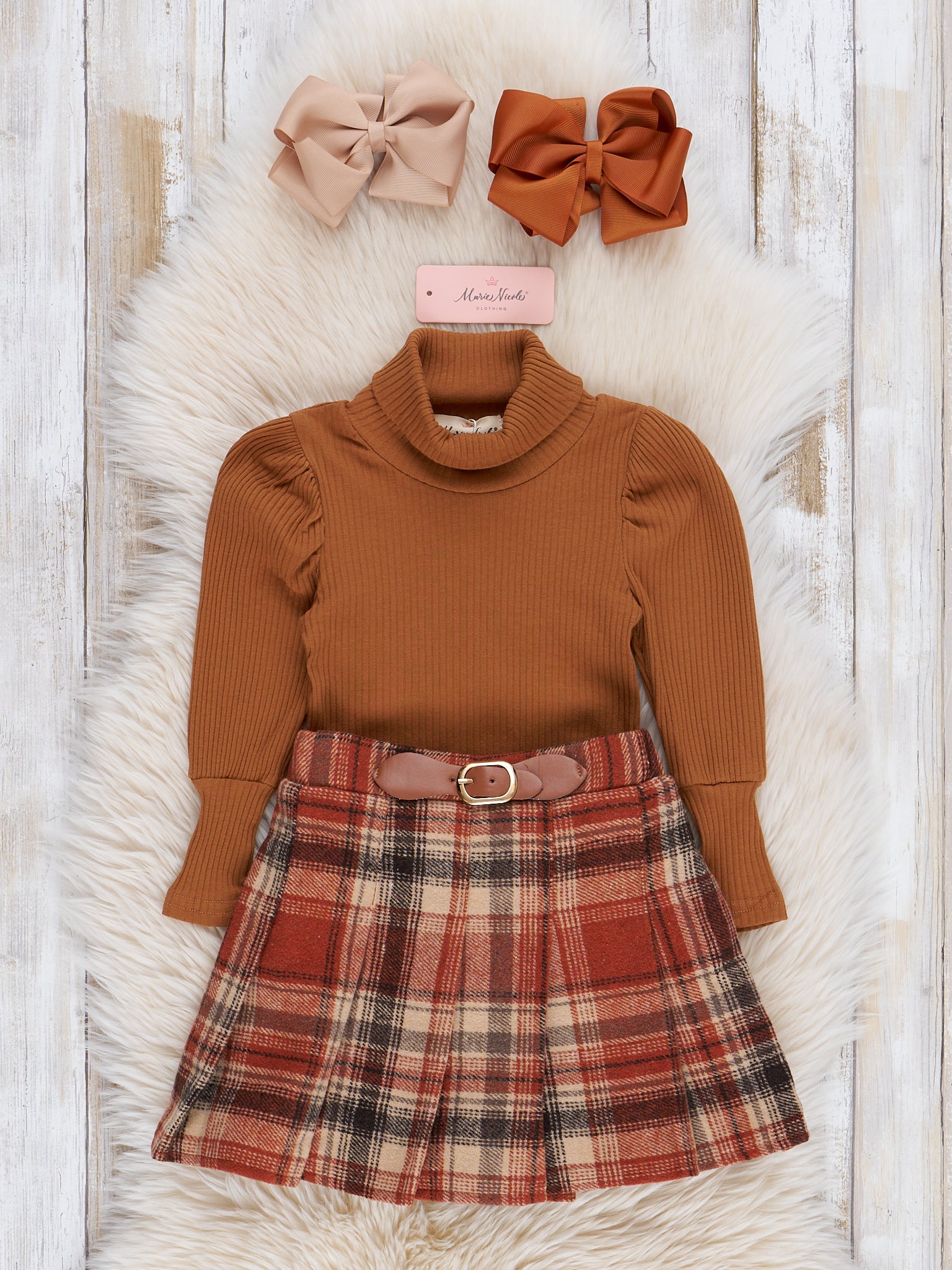 Ribbed Turtleneck & Plaid Skirt Outfit - Cinnamon