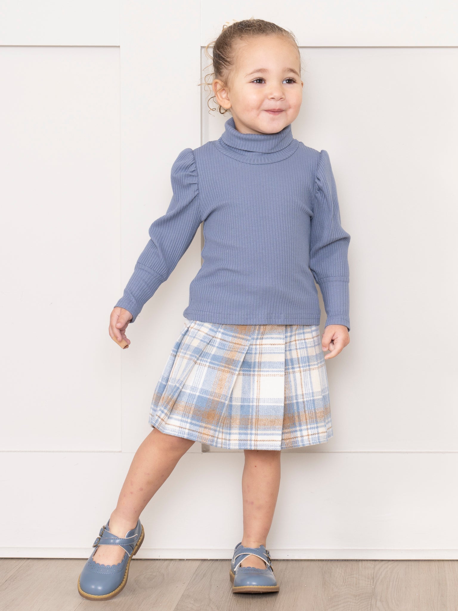 Ribbed Turtleneck & Plaid Skirt Set - Blue