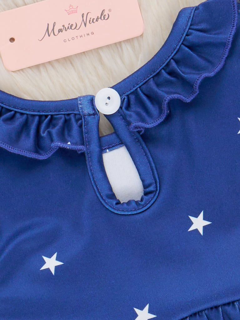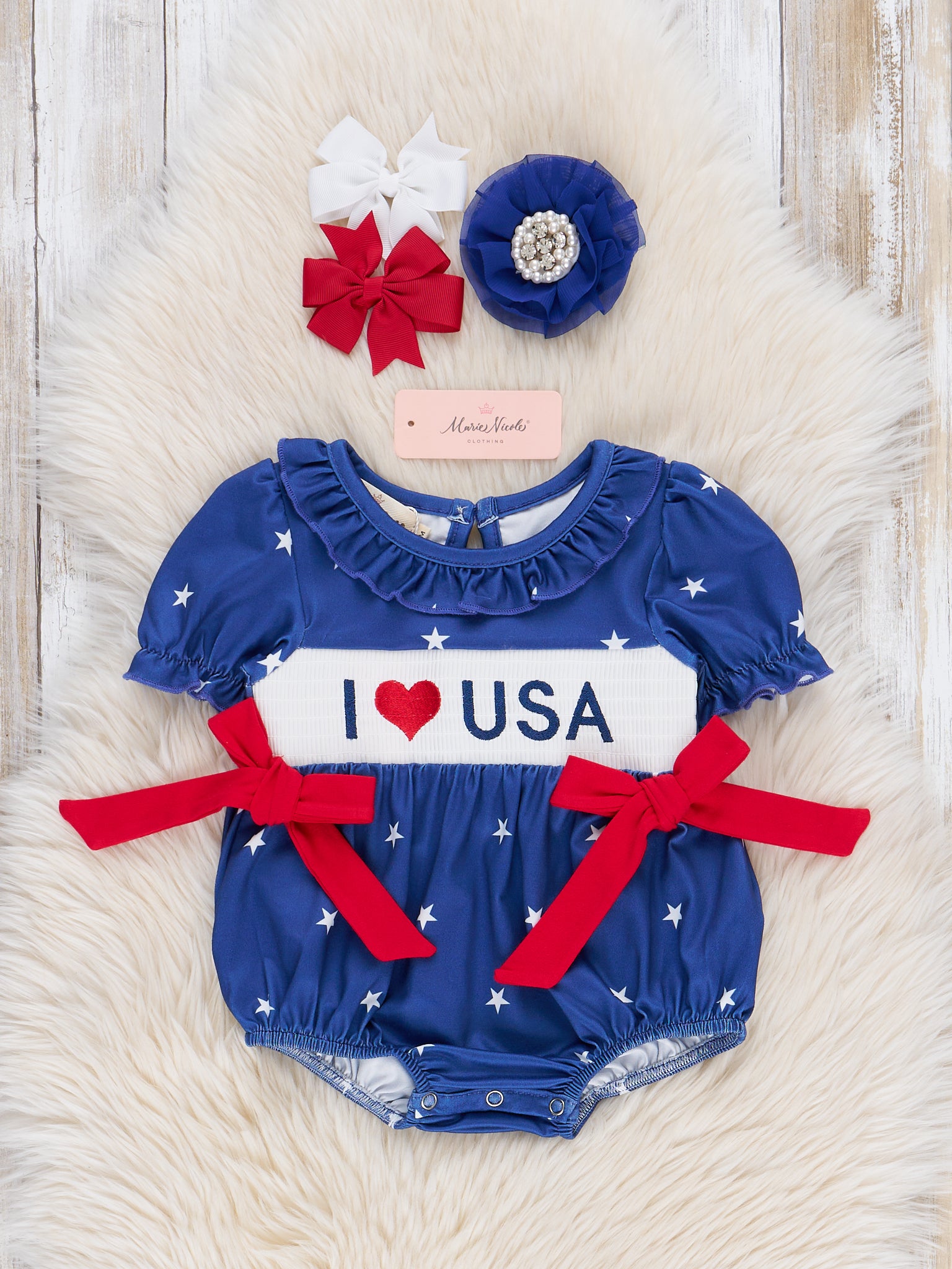 Celebrate Independence Day in style with our USA Love Smocked Bow Bubble! This adorable girls' buble features an embroidered "I ❤️ USA" design over smocking, blue star print, and red ruffles and bows, perfect for a patriotic look. Complete the look with our coordinating sibling set from Marie Nicole Clothing.