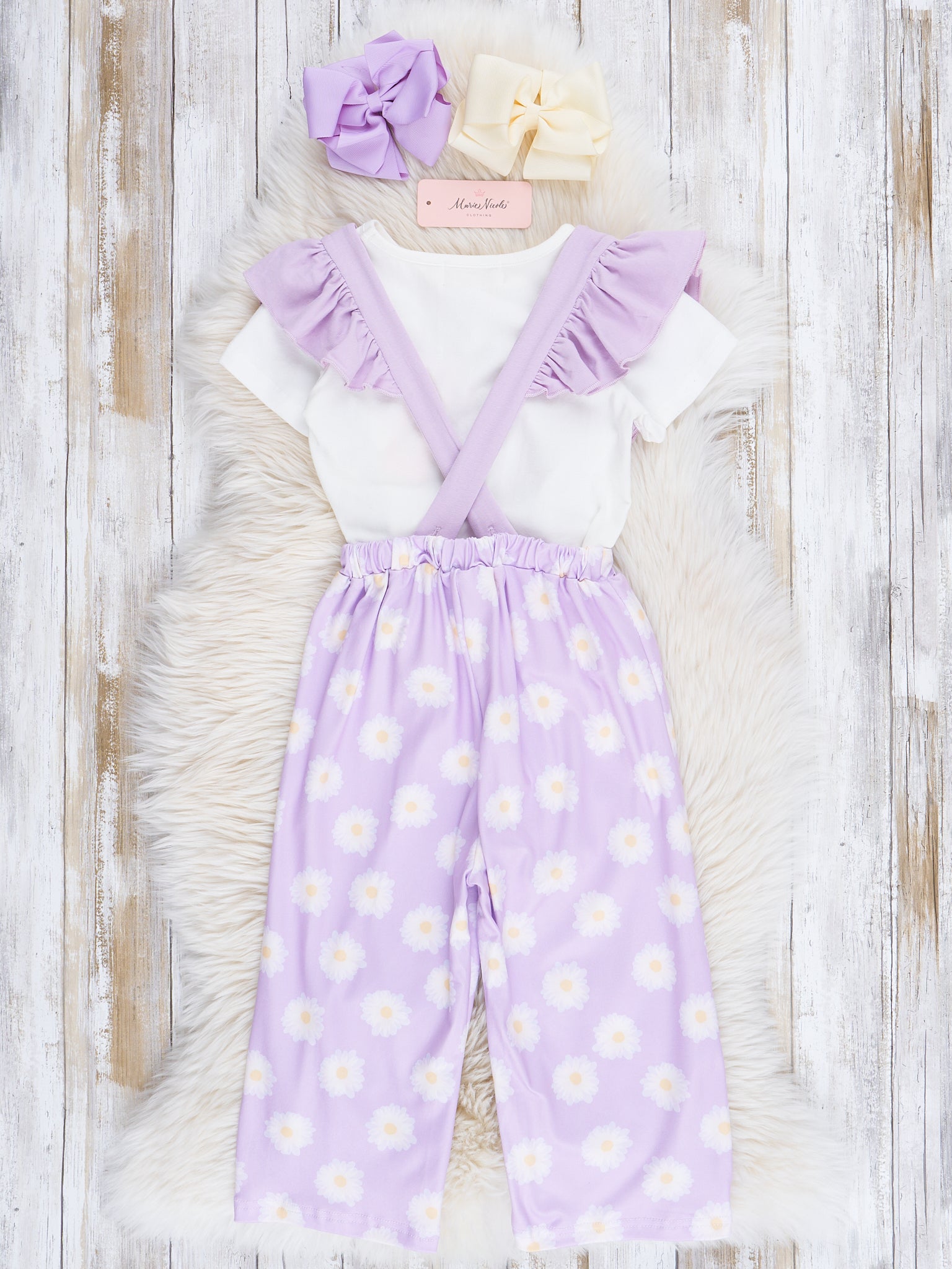 Get ready to bloom in these Lilac Daisies Overalls Set. The ruffle straps and daisy print add a whimsical touch, while the soft white t-shirt keeps you comfortable. Perfect for a day at the park or a picnic with friends. Don't miss out on this playful and charming outfit!