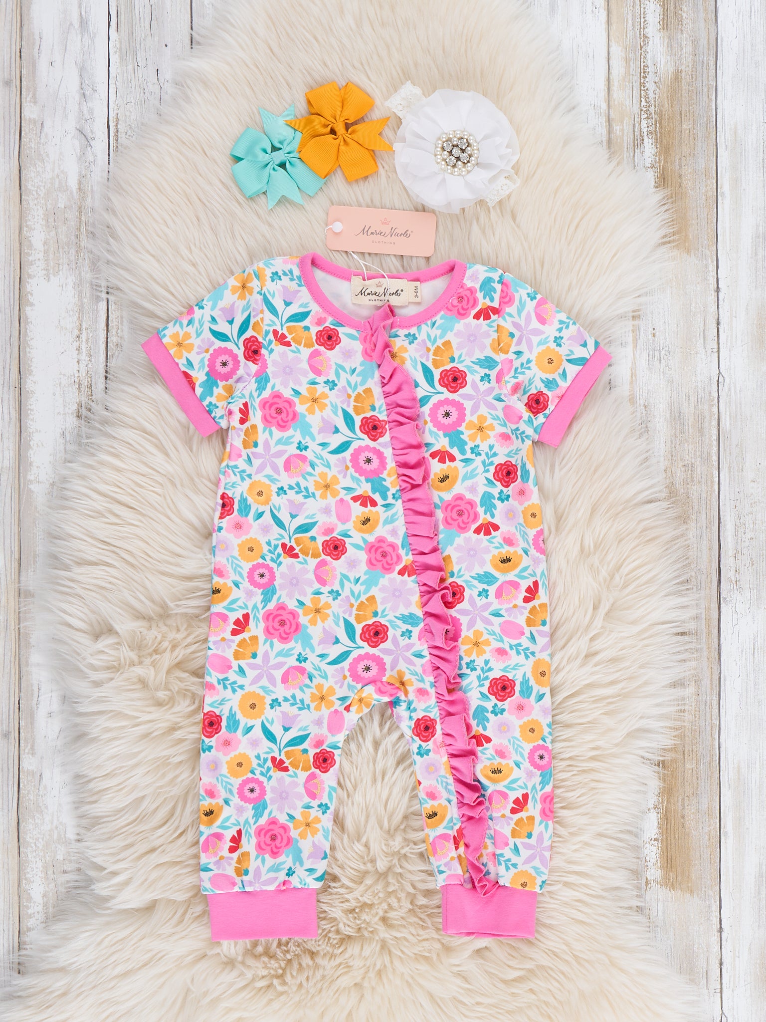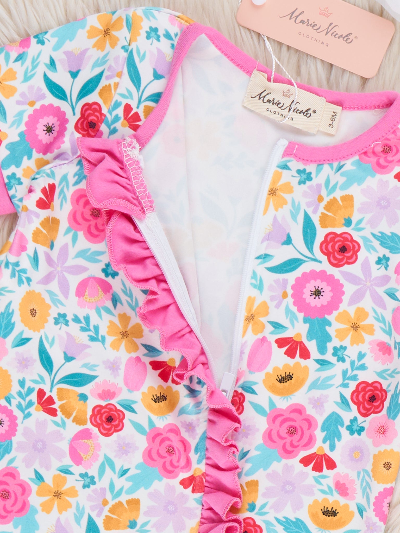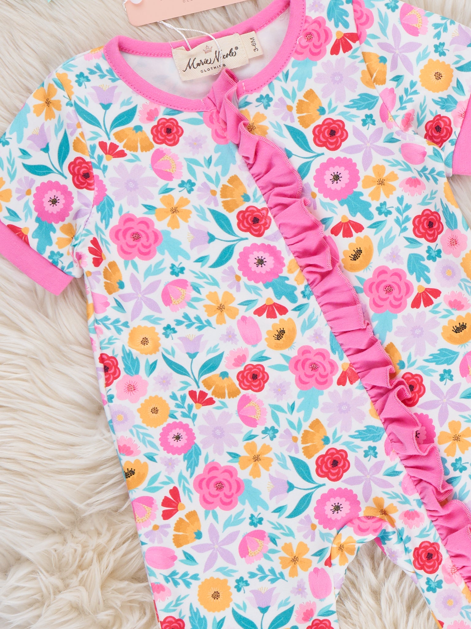 The Garden Fresh Cutie Sleeper Pajamas by Marie Nicole Clothing offer the perfect blend of comfort and charm. Featuring a vibrant floral print and soft ruffle details along the front, these pajamas keep little ones cozy all night long. Ideal for sleepovers, bedtime snuggles, and sweet dreams, they provide comfort while adding a pop of color to bedtime routines.
