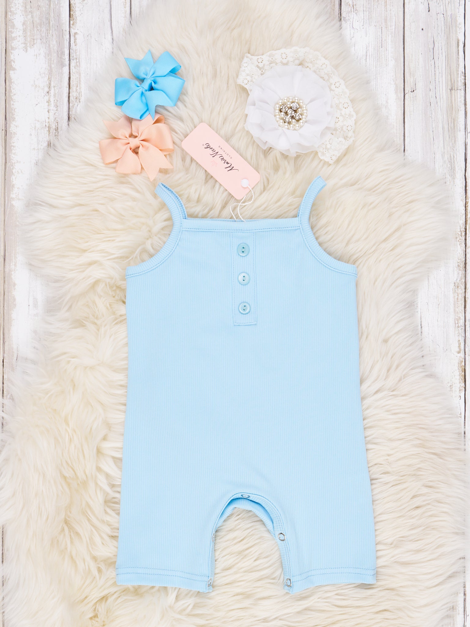 Introduce a little class to your kiddos wardrobe with these tank rompers! This baby blue romper is a perfect combination of style and comfort, featuring a ribbed design with decorative buttons! Perfect for extra special occasions!