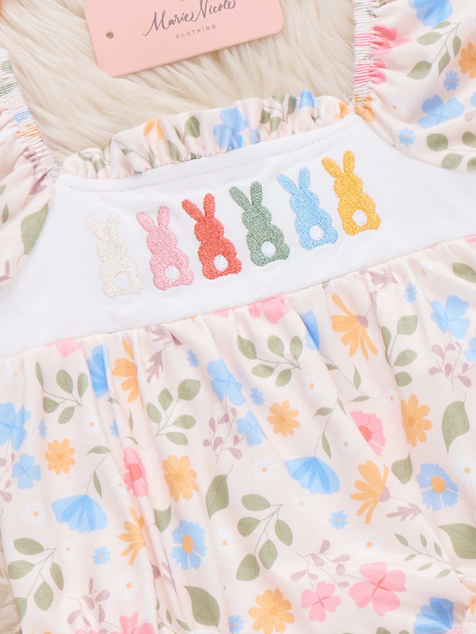 We love the Blossom Hop Embroidered Bubble by Marie Nicole Clothing! This romper features a pastel floral print with puff sleeves, colorful embroidered bunnies on white fabric, and soft, ruffled leg openings for a sweet, spring-ready baby look.