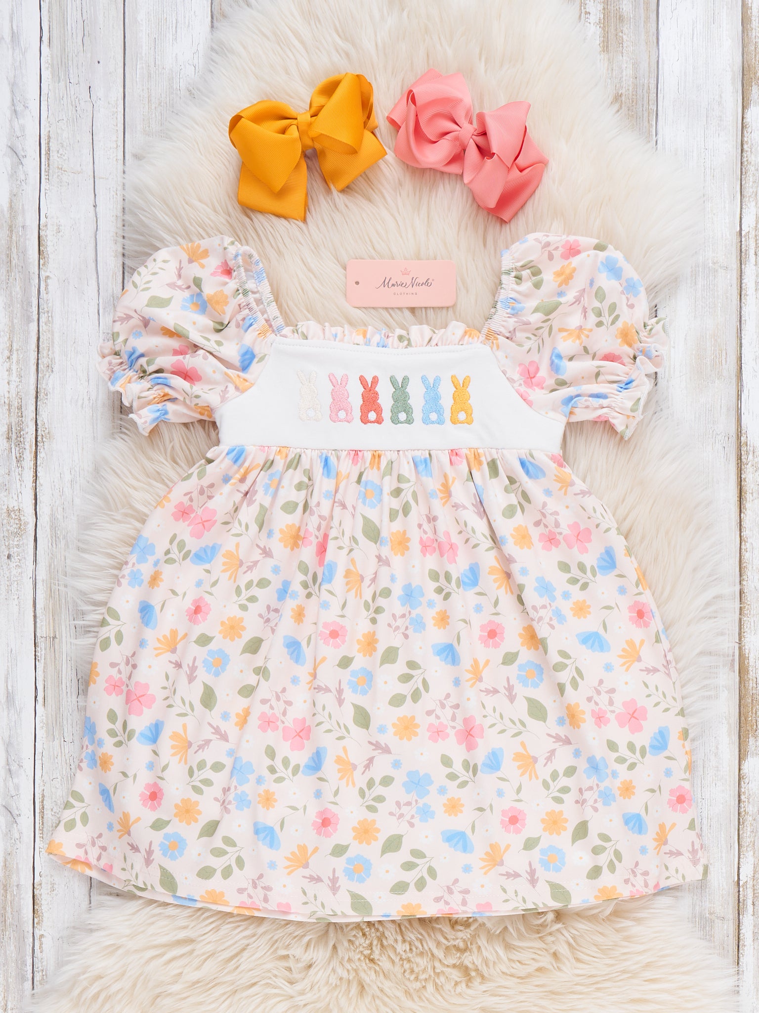 We love the Blossom Hop Embroidered Dress by Marie Nicole Clothing! This dress features a pastel floral print, puff sleeves, and colorful bunny embroidery on white fabric, for a cheerful and whimsical look, perfect for spring celebrations or Easter events.