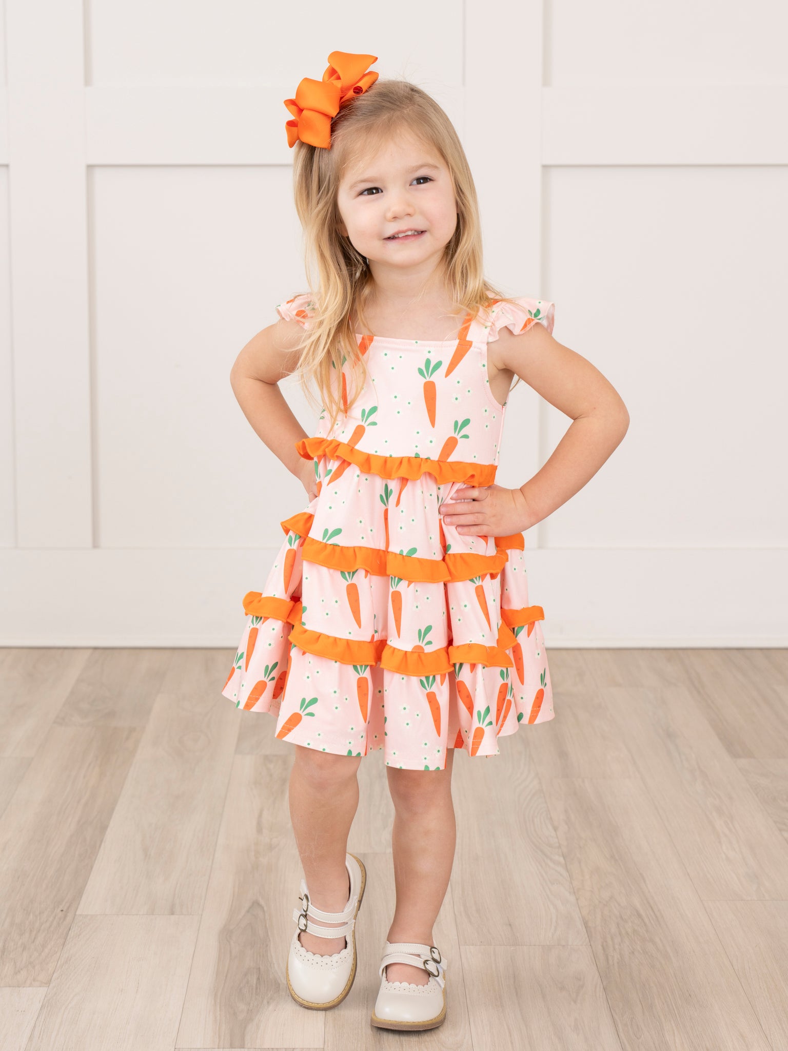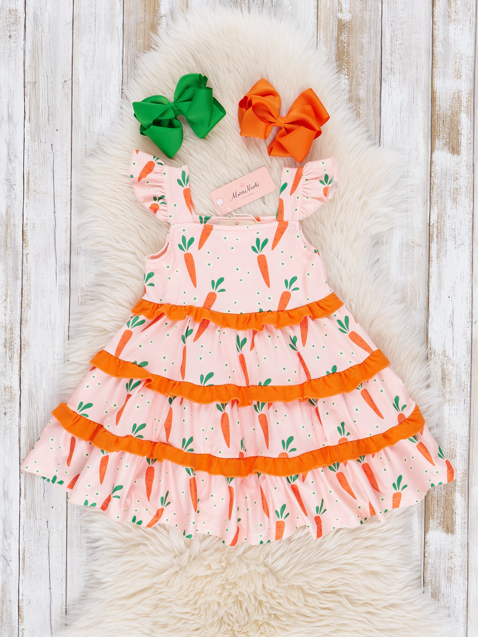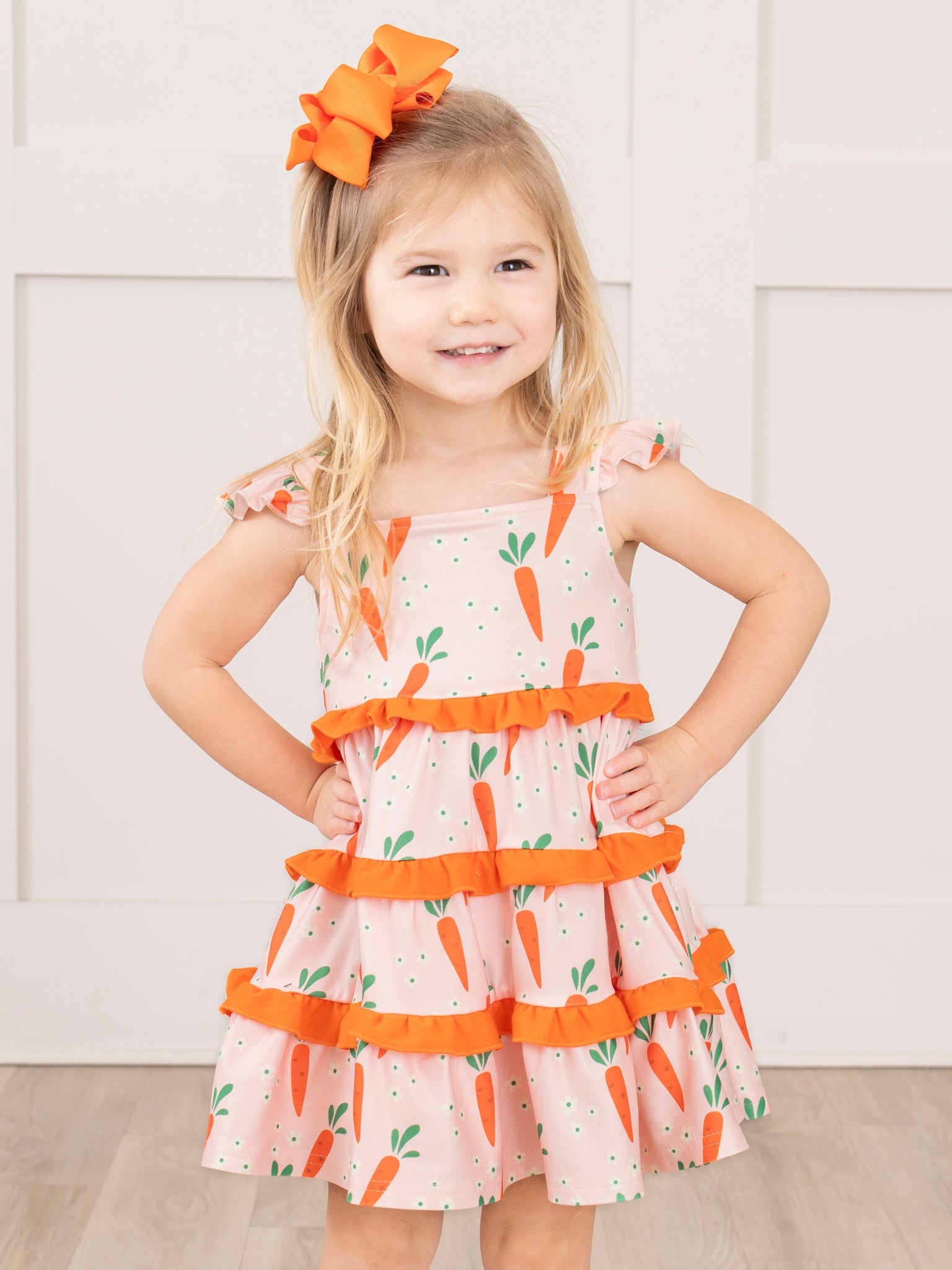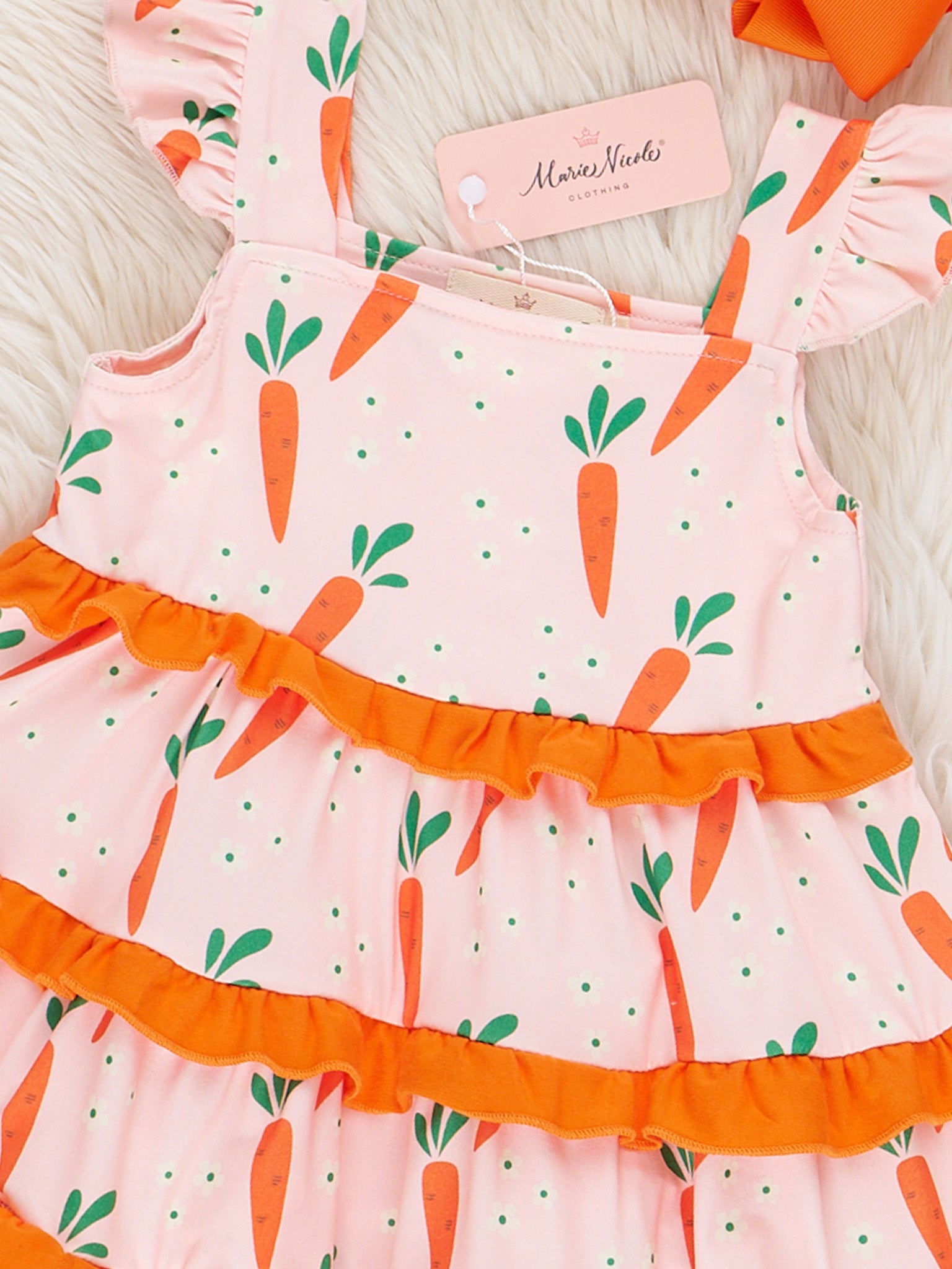 This Charming Carrot Flutter Sleeve Dress by Marie Nicole Clothing will be the root of happiness this spring! This dress features little carrot details, tiered ruffles, & flutter sleeves.