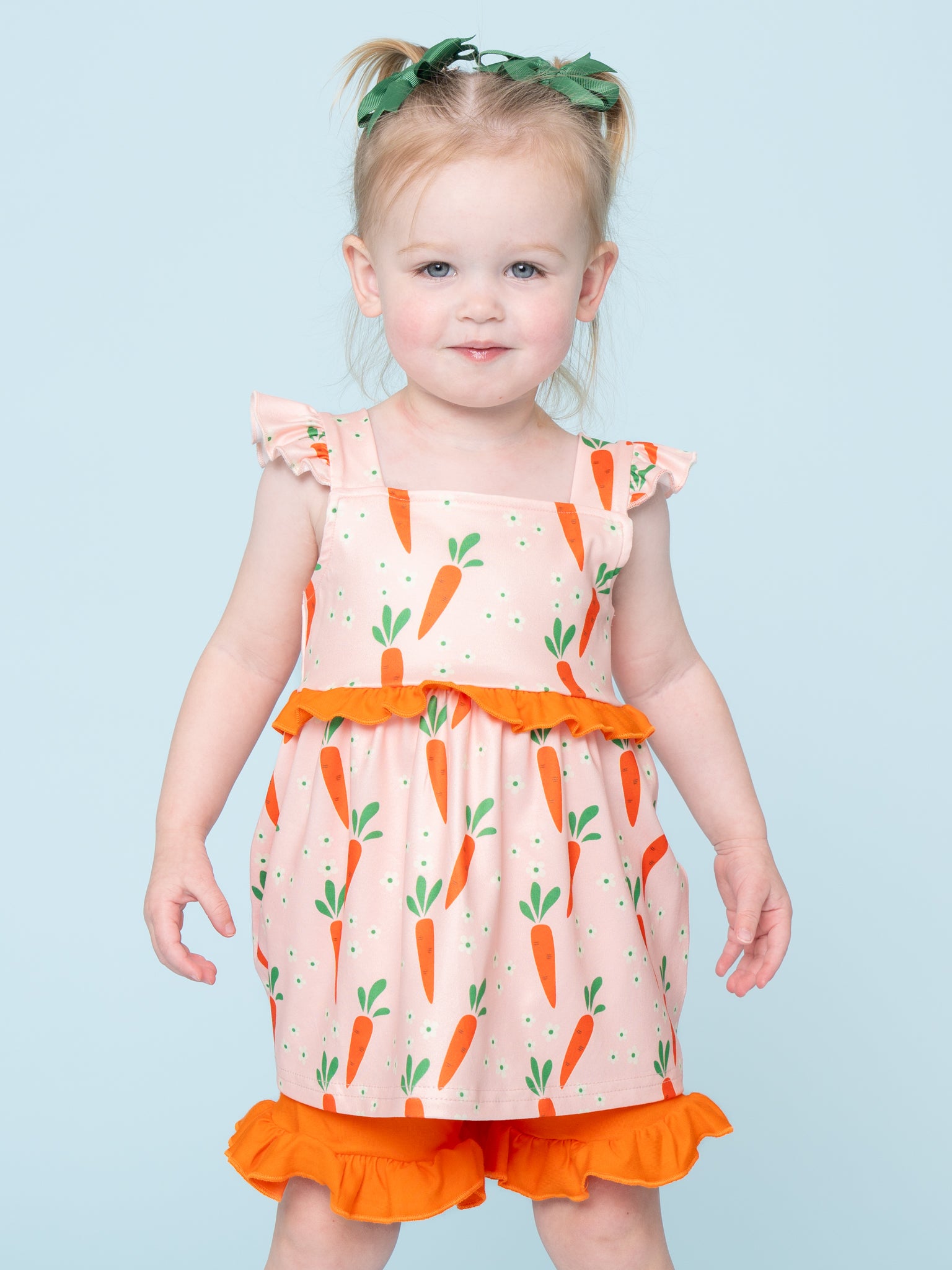This Charming Carrot Flutter Sleeve Outfit will be the root of happiness this spring by Marie Nicole Clothing! This outfit features a peach top with little carrot details, ruffle trim, flutter sleeves, & ruffle shorts with an elastic waistband.