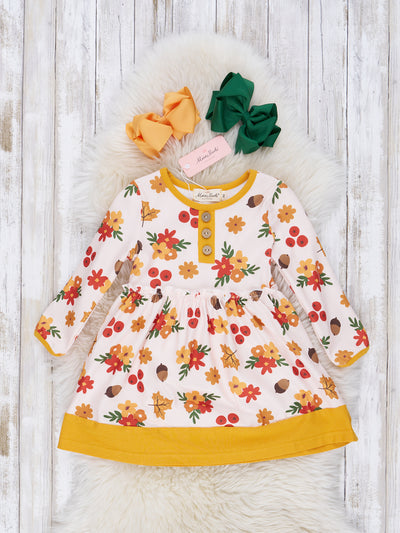 Fall florals abound throughout this sister set! This flower-patterned dress features three-button henley collar, cinched waist, long sleeves, and yellow trim detail at the collar, sleeves, and hem.