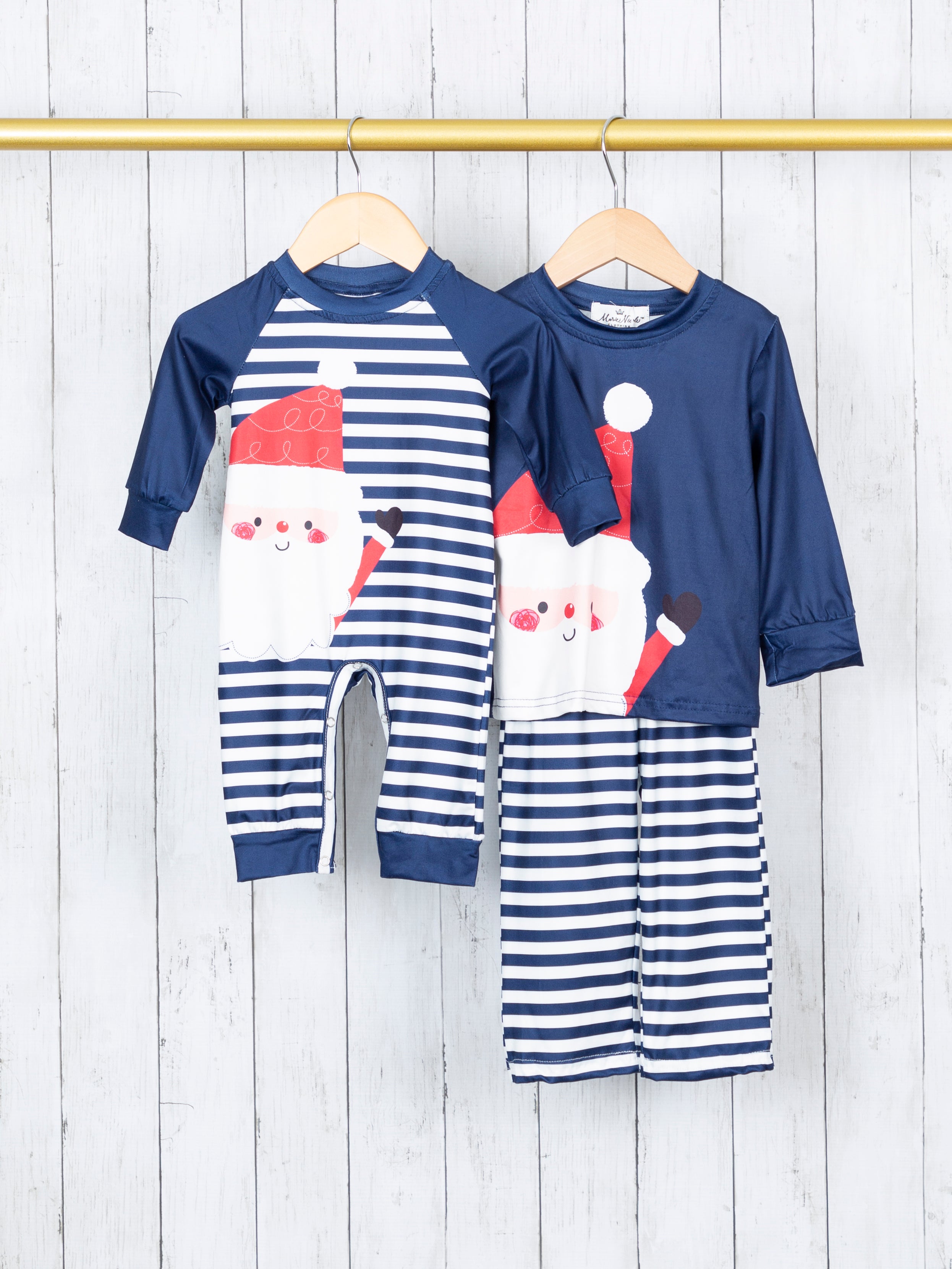 This festive sibling set is guaranteed to keep your kiddos on the nice list! This romper features the jolliest Santa detail, stripes, & navy raglan sleeves.