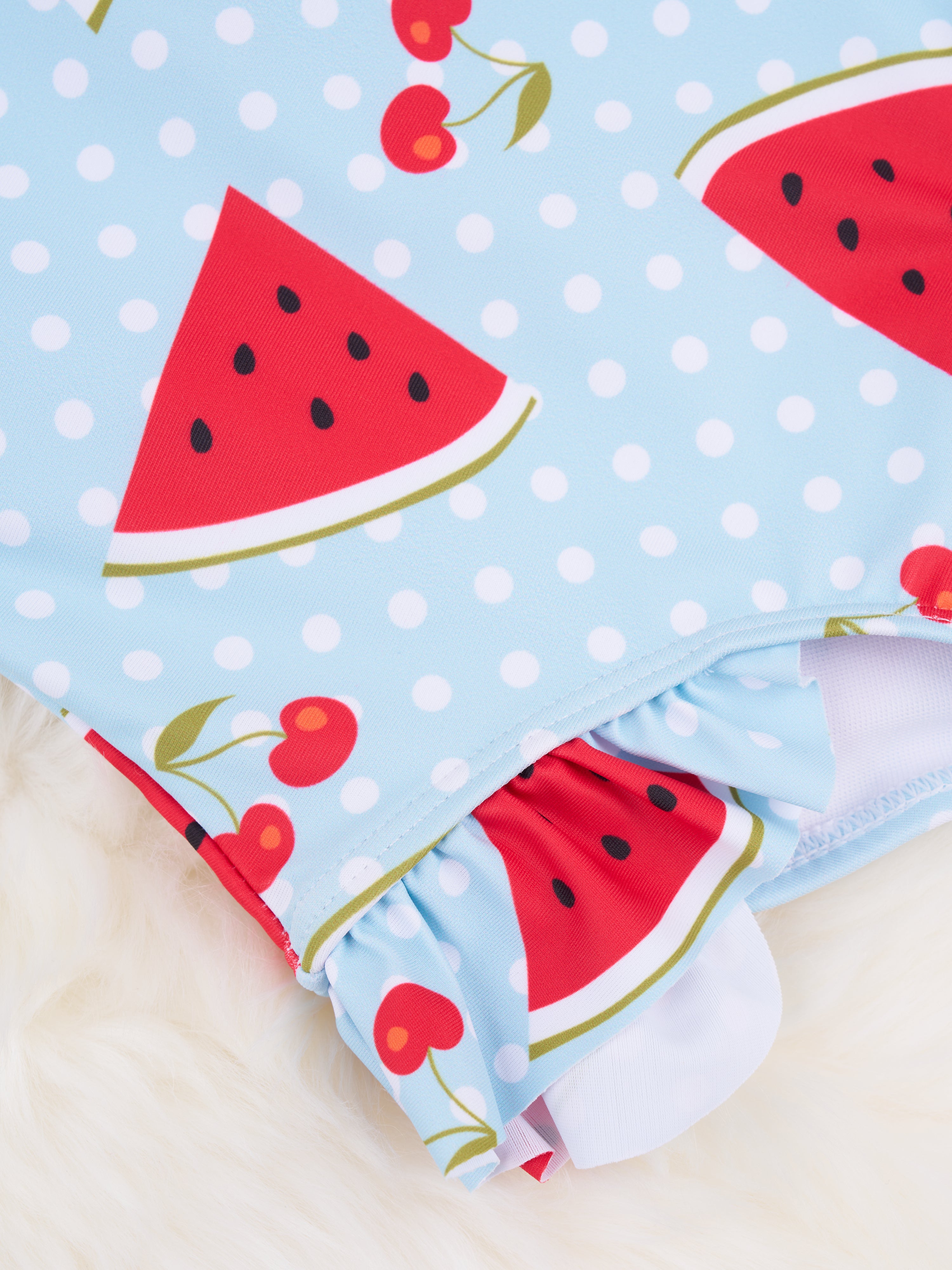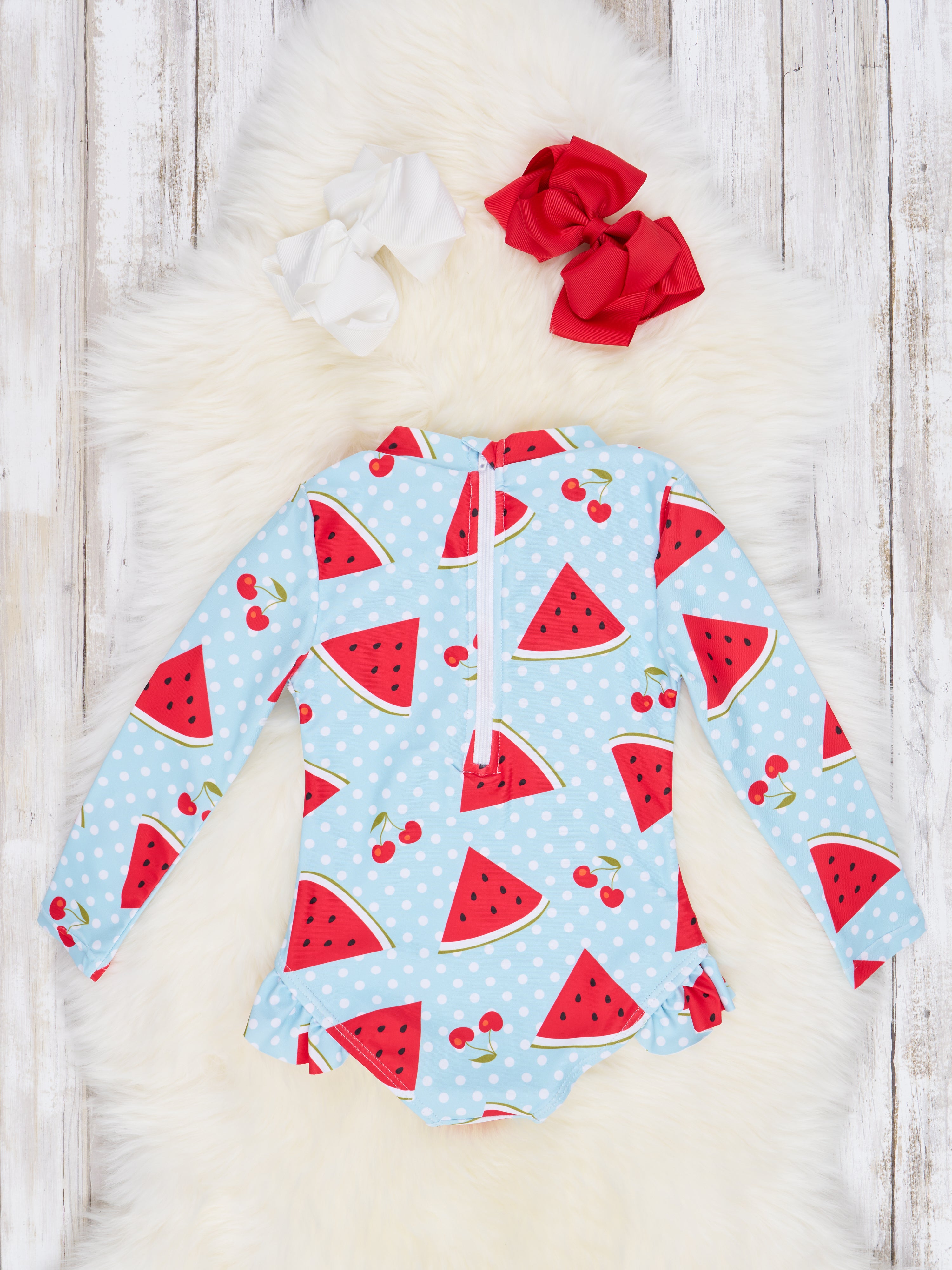 Chase away the summertime blues with this fun-in-the-sun Watermelon Ruffle Rash Guard Swimsuit! Designed for kids, it boasts a cheerful watermelon print and cute ruffles, plus a practical zipper back, for a look that's a berry good time!