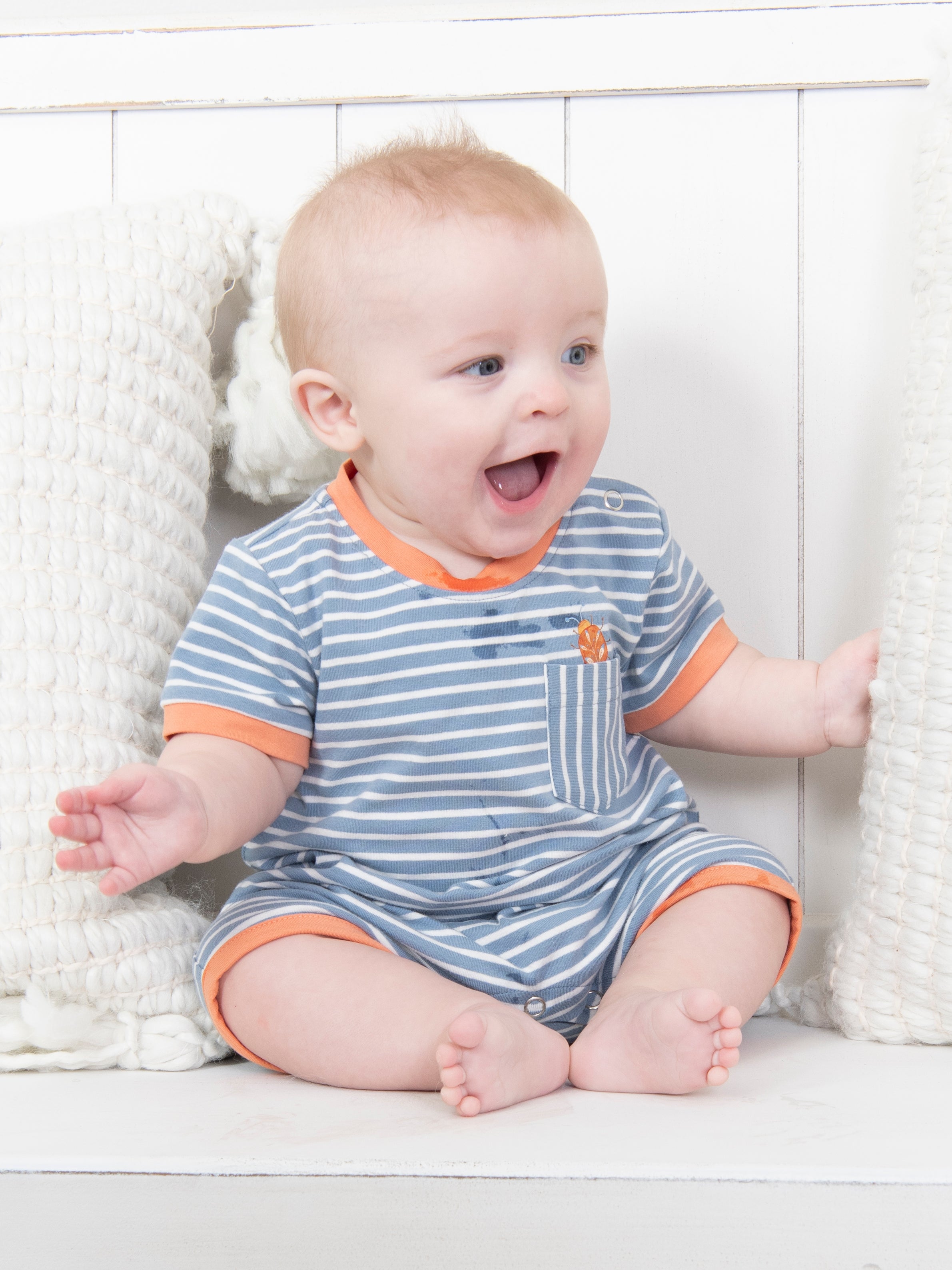 Springtime is just around the corner & this MNC exclusive collection is a MUST-HAVE this season! This high-quality collection has the softest material & is made to grow with your little one! This romper features our Tennessee Garden stripes, a patch pocket, a darling bug detail, coral trim, & snap buttons at the shoulder.