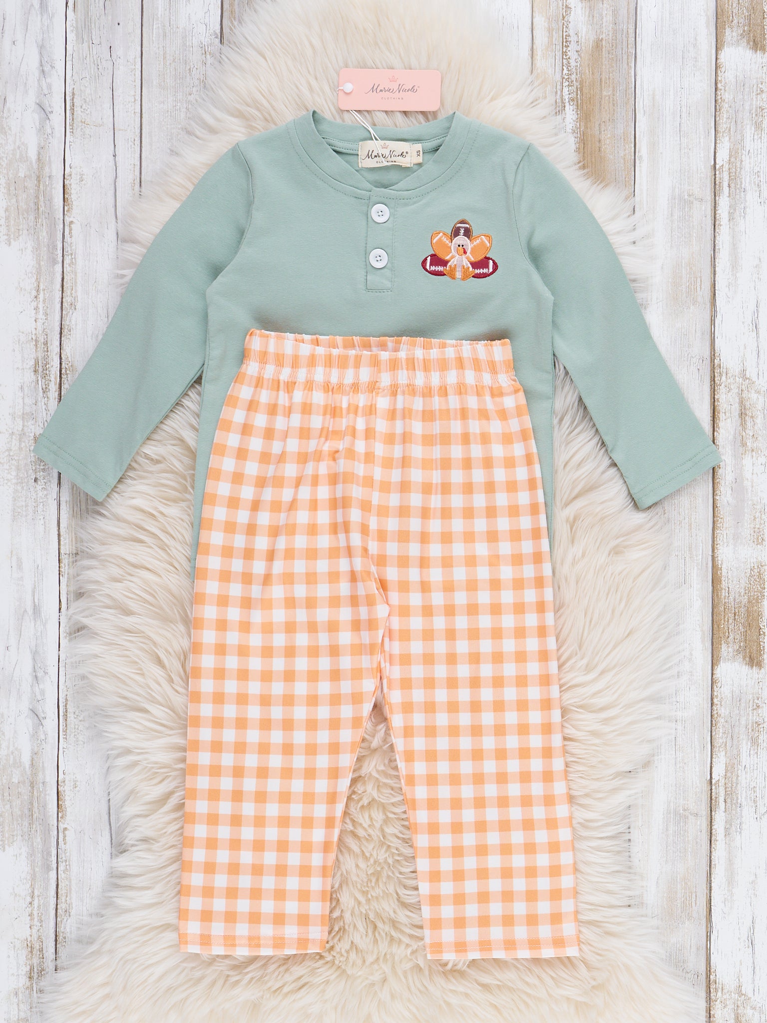The Football Feathers Embroidered Outfit by Marie Nicole Clothing features a long-sleeve design with plaid trim, a button-front neckline, and an embroidered turkey detail on the chest. This romper offers a cozy and festive look, making it ideal for Thanksgiving gatherings, game days, and autumn celebrations.