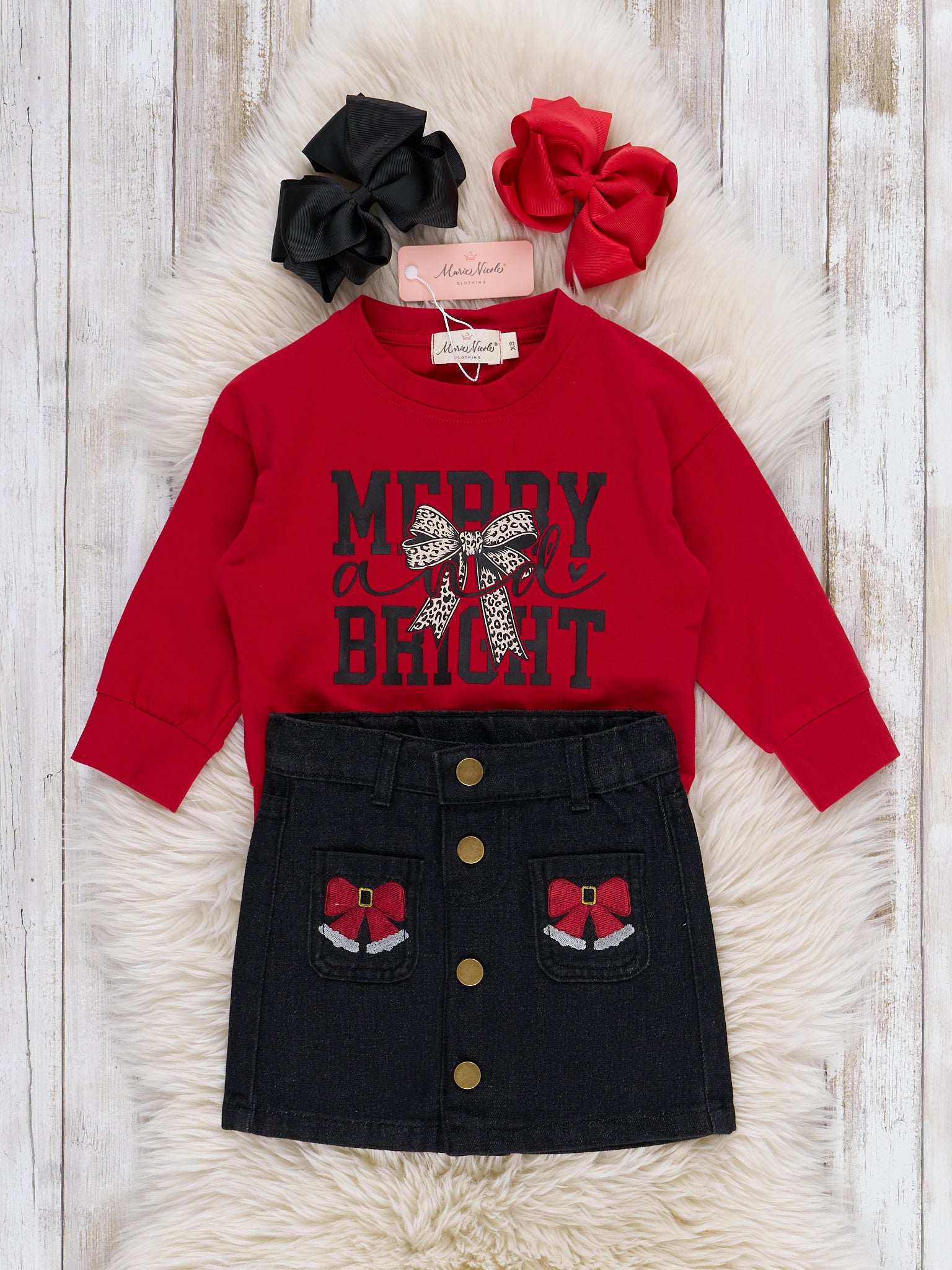 The "Merry and Bright" Embroidered Skirt Outfit from Marie Nicole Clothing is a holiday-ready set featuring a festive knit top with a bold “Merry and Bright” design accented by a bow, paired with a button-front skirt adorned with sweet embroidered bow details. Combining seasonal style with everyday comfort, this outfit is perfect for Christmas gatherings, family photos, and creating cheerful holiday memories.