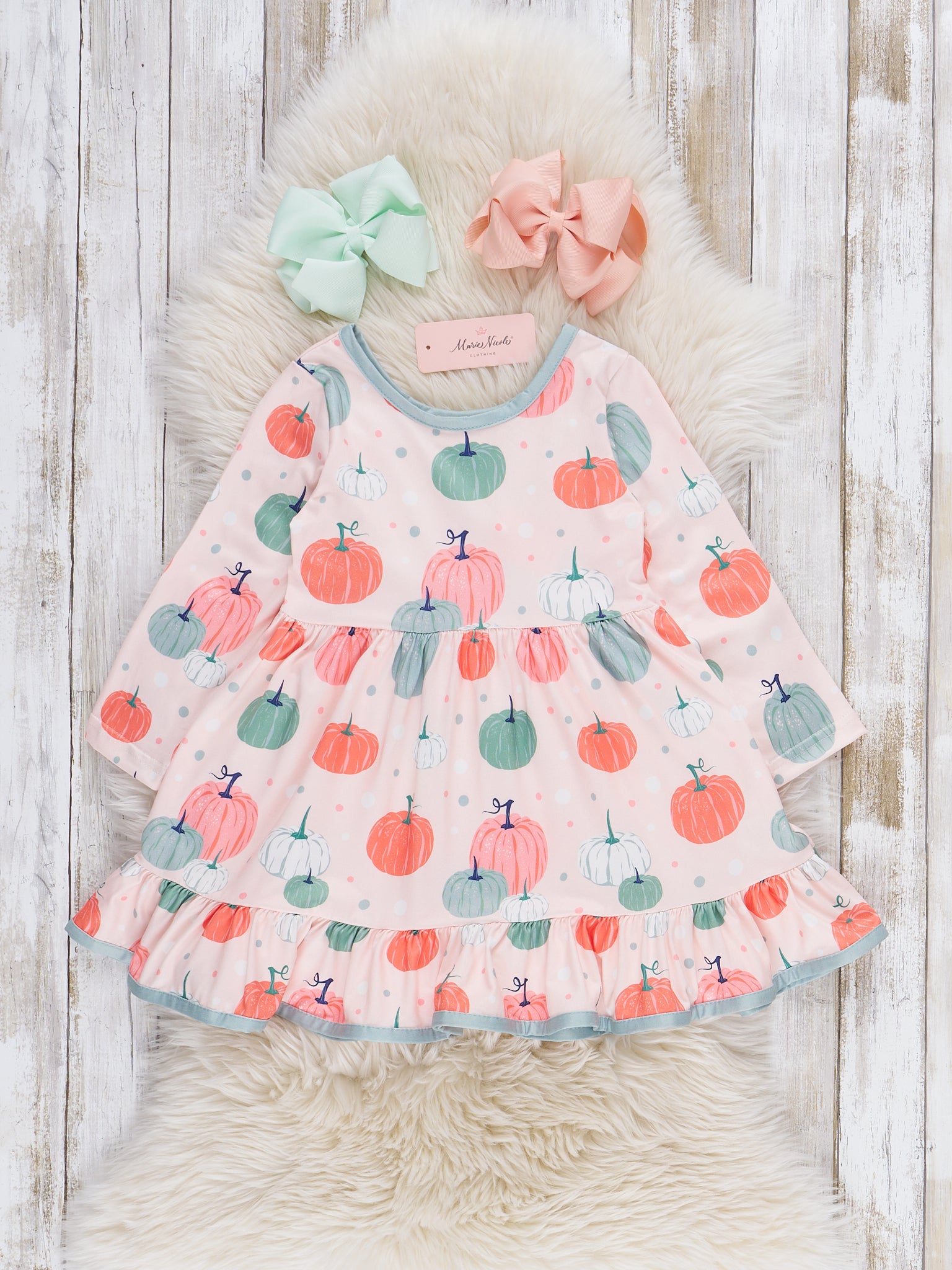 The Pumpkin Spiced Cuddles Ruffle Dress by Marie Nicole Clothing features a charming allover pumpkin print, long sleeves, and a ruffled hem for added twirl and style. This soft, comfy dress is perfect for fall festivities, family photos, and everyday seasonal outings, bringing playful autumn vibes to any occasion.