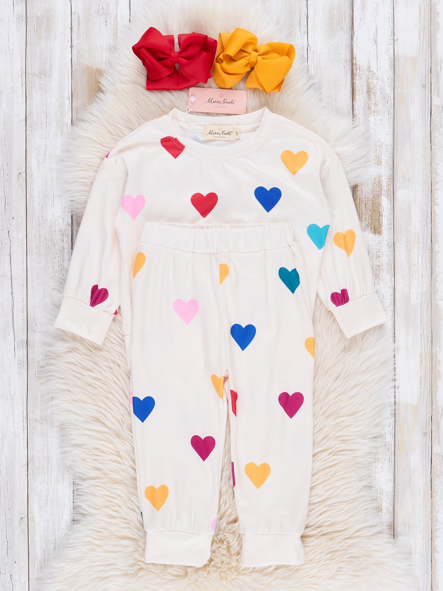 This adorable set is sure to bring a smile to your Valentine's celebration! It features a top and pull on pants with rainbow hearts.